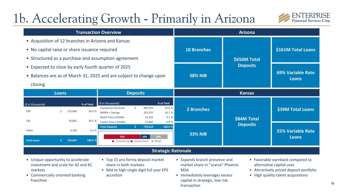 15 Significant opportunities for growth and share gain in our markets Region Total Deposits ($B) Total Loans ($B) Market Profile Metro Midwest $6.3 $3.2 Stable St. Louis Kansas City Southwest $2.1 $1.9 Stable Albuquerque2 Growth Phoenix Dallas Las Vegas West $1.3 $1.9 Growth Los Angeles San Diego Deposit Verticals / Specialty Lending $3.6 $4.4 Total $13.3 $11.4 Note: 2Q25 data 1Specialty Lending includes "Other" Loans 2The Combined Statistical Area includes Albuquerque, Santa Fe and Los Alamos 1 1a. Well-Positioned in Attractive Markets