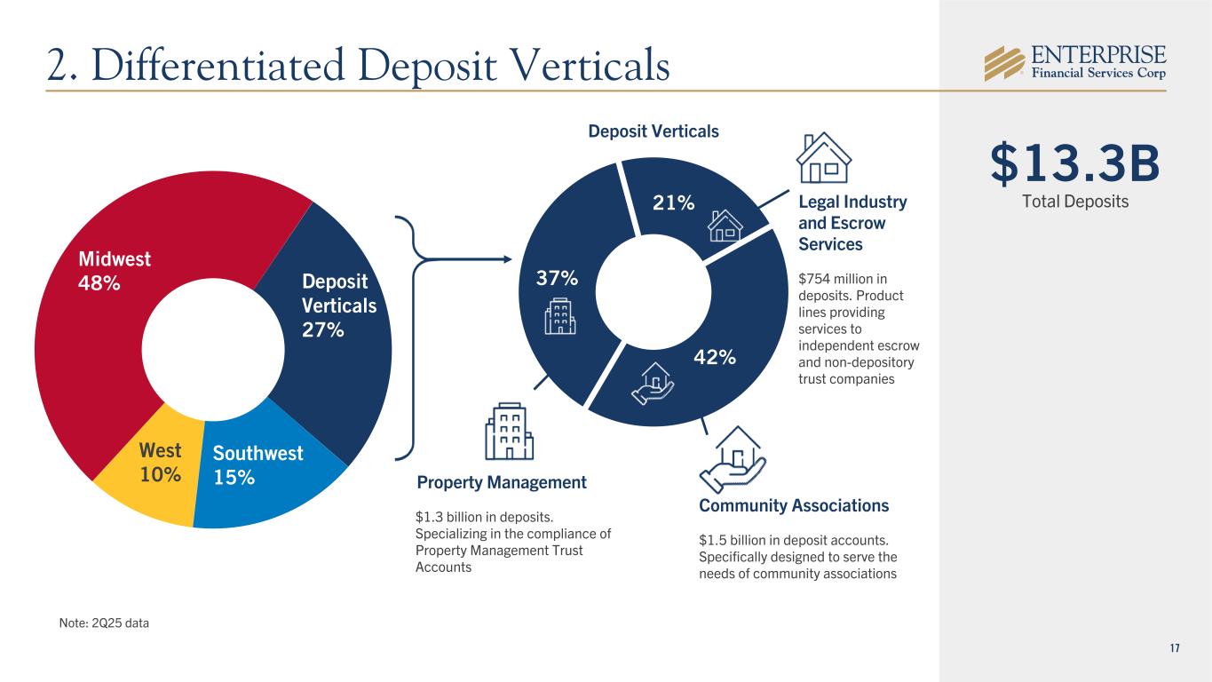 16 ($ in thousands) % of Total CRE $ 113,668 56.9 % C&I 76,865 38.5 % Other 9,109 4.6 % Total Loans $ 199,642 100.0 % Strategic Rationale Loans Deposits 10 Branches $656M Total Deposits $161M Total Loans 69% Variable Rate Loans 38% NIB $84M Total Deposits $39M Total Loans 55% Variable Rate Loans • Unique opportunity to accelerate investment and scale for AZ and KC markets • Commercially oriented banking franchise ($ in thousands) % of Total Transaction Accounts $ 405,423 54.8 % MMDA + Savings 267,070 36.1 % Retail Time (<$250K) 31,439 4.3 % Jumbo Time (>$250K) 35,686 4.8 % Total Deposits $ 739,618 100.0 % Commercial Government Retail • Expands branch presence and market share in “scarce” Phoenix MSA • Immediately leverages excess capital in strategic, low risk transaction 55% 16% 29% 2 Branches 33% NIB Kansas • Favorable earnback compared to alternative capital uses • Attractively priced deposit portfolio • High quality talent acquisitions • Top 15 pro forma deposit market share in both markets • Mid to high single digit full year EPS accretion Transaction Overview • Acquisition of 12 branches in Arizona and Kansas • No capital raise or share issuance required • Structured as a purchase and assumption agreement • Expected to close by early fourth quarter of 2025 • Balances are as of March 31, 2025 and are subject to change upon closing Arizona 1b. Accelerating Growth - Primarily in Arizona
