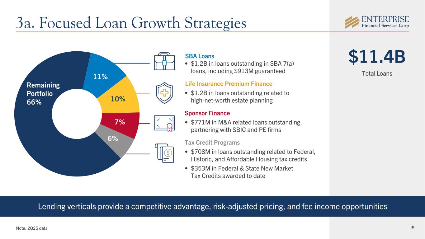 17 21% 42% 37% Community Associations $1.5 billion in deposit accounts. Specifically designed to serve the needs of community associations Property Management $1.3 billion in deposits. Specializing in the compliance of Property Management Trust Accounts Legal Industry and Escrow Services $754 million in deposits. Product lines providing services to independent escrow and non-depository trust companies Deposit Verticals Note: 2Q25 data Deposit Verticals 27% Southwest 15% West 10% Midwest 48% 2. Differentiated Deposit Verticals $13.3B Total Deposits