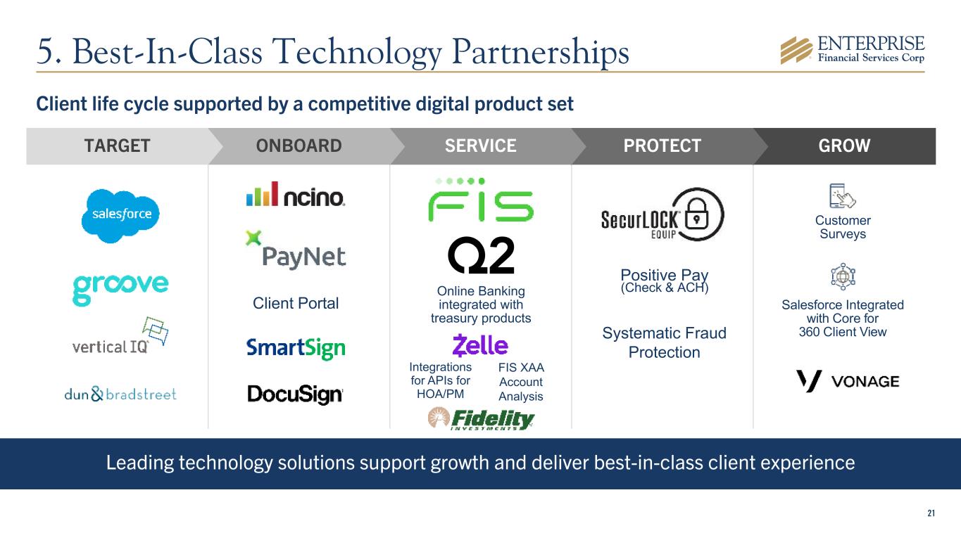 20 Additional talent delivering deposit and loan growth 11: Los Angeles 10: San Diego 5: Phoenix & Las Vegas Talent acquisitions between 2021 & 2Q25 4. High-Quality Talent Additions Through Focused Efforts 29 Producers Opportunistically Hired: Adds Density and Capability in Focus Geographies 3: Mid-Cities, TX