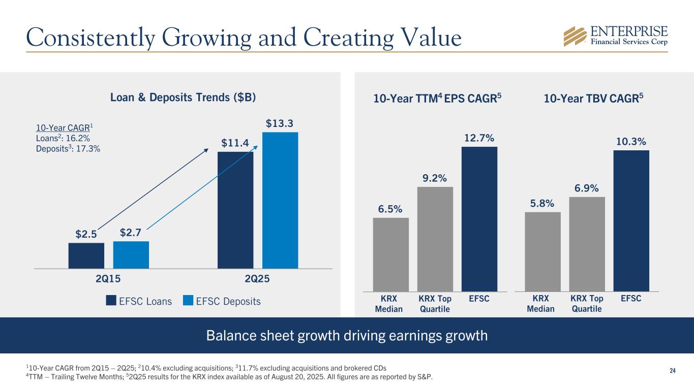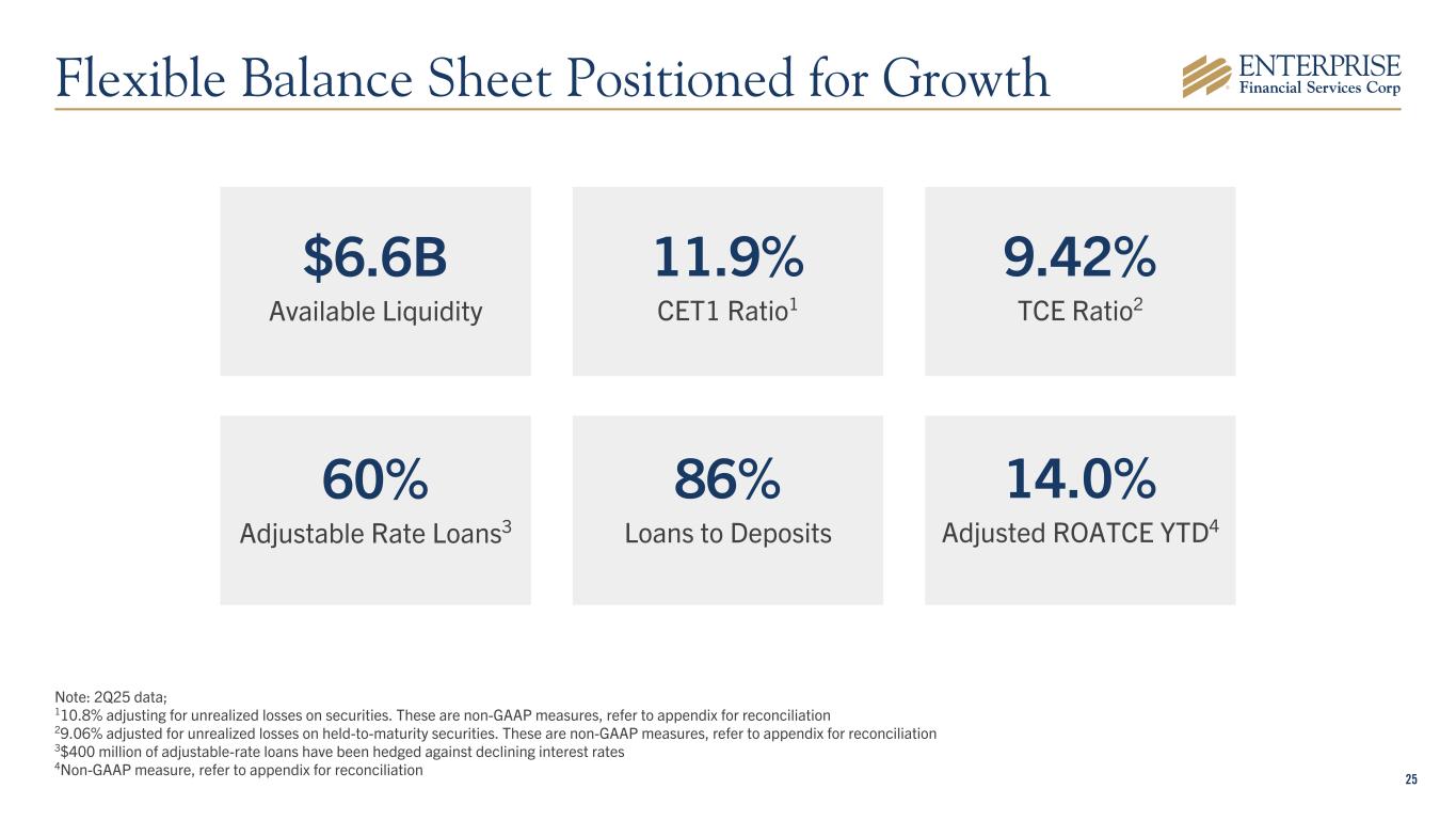 24 Loan & Deposits Trends ($B) $2.5 $11.4 $2.7 $13.3 EFSC Loans EFSC Deposits 2Q15 2Q25 Balance sheet growth driving earnings growth 10-Year TBV CAGR510-Year TTM4 EPS CAGR5 110-Year CAGR from 2Q15 – 2Q25; 210.4% excluding acquisitions; 311.7% excluding acquisitions and brokered CDs 4TTM – Trailing Twelve Months; 52Q25 results for the KRX index available as of August 20, 2025. All figures are as reported by S&P. 10-Year CAGR1 Loans2: 16.2% Deposits3: 17.3% 6.5% 9.2% 12.7% KRX Median KRX Top Quartile EFSC 5.8% 6.9% 10.3% KRX Median KRX Top Quartile EFSC Consistently Growing and Creating Value