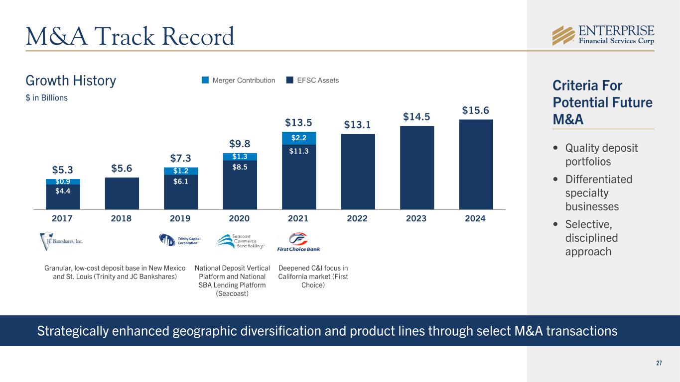 26 High Capital Retention Rate • Strong earnings profile • Sustainable dividend profile Support Robust Asset Growth • Organic loan and deposit growth • High-quality M&A to enhance commercial franchise and geographic diversification Maintain High-Quality Capital Stack • Minimize WACC over time (preferred, sub debt, etc.) • Optimize capital levels CET1 ~10%, Tier 1 ~12%, and Total Capital ~14% Maintain 8-9% TCE • M&A deal structures • Drives ROATCE above peer levels Capital Allocation Priorities • Maintain TCE ratio of 8-9% • Active stock repurchase program • Regular dividend increases • Strategic flexibility for organic growth, M&A and other uses of capital Low Cost, Highly Flexible Capital Strategy