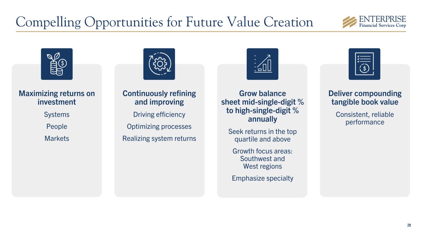 27 $5.3 $5.6 $7.3 $9.8 $13.5 $13.1 $14.5 $15.6 $4.4 $6.1 $8.5 $11.3 $0.9 $1.2 $1.3 $2.2 Merger Contribution EFSC Assets 2017 2018 2019 2020 2021 2022 2023 2024 Strategically enhanced geographic diversification and product lines through select M&A transactions Growth History $ in Billions Granular, low-cost deposit base in New Mexico and St. Louis (Trinity and JC Bankshares) National Deposit Vertical Platform and National SBA Lending Platform (Seacoast) Deepened C&I focus in California market (First Choice) M&A Track Record Criteria For Potential Future M&A • Quality deposit portfolios • Differentiated specialty businesses • Selective, disciplined approach