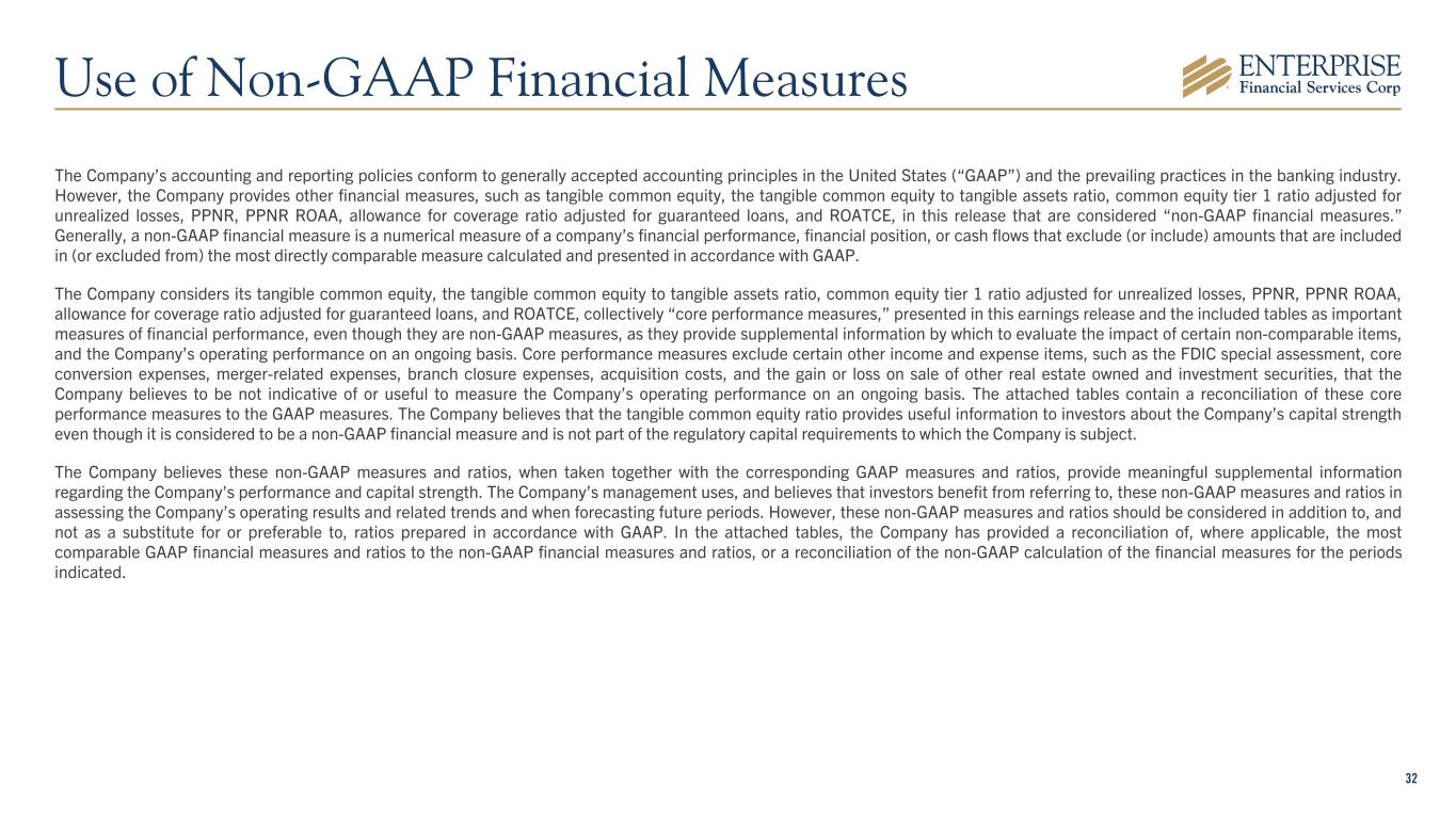 32 The Company’s accounting and reporting policies conform to generally accepted accounting principles in the United States (“GAAP”) and the prevailing practices in the banking industry. However, the Company provides other financial measures, such as tangible common equity, the tangible common equity to tangible assets ratio, common equity tier 1 ratio adjusted for unrealized losses, PPNR, PPNR ROAA, allowance for coverage ratio adjusted for guaranteed loans, and ROATCE, in this release that are considered “non-GAAP financial measures.” Generally, a non-GAAP financial measure is a numerical measure of a company’s financial performance, financial position, or cash flows that exclude (or include) amounts that are included in (or excluded from) the most directly comparable measure calculated and presented in accordance with GAAP. The Company considers its tangible common equity, the tangible common equity to tangible assets ratio, common equity tier 1 ratio adjusted for unrealized losses, PPNR, PPNR ROAA, allowance for coverage ratio adjusted for guaranteed loans, and ROATCE, collectively “core performance measures,” presented in this earnings release and the included tables as important measures of financial performance, even though they are non-GAAP measures, as they provide supplemental information by which to evaluate the impact of certain non-comparable items, and the Company’s operating performance on an ongoing basis. Core performance measures exclude certain other income and expense items, such as the FDIC special assessment, core conversion expenses, merger-related expenses, branch closure expenses, acquisition costs, and the gain or loss on sale of other real estate owned and investment securities, that the Company believes to be not indicative of or useful to measure the Company’s operating performance on an ongoing basis. The attached tables contain a reconciliation of these core performance measures to the GAAP measures. The Company believes that the tangible common equity ratio provides useful information to investors about the Company’s capital strength even though it is considered to be a non-GAAP financial measure and is not part of the regulatory capital requirements to which the Company is subject. The Company believes these non-GAAP measures and ratios, when taken together with the corresponding GAAP measures and ratios, provide meaningful supplemental information regarding the Company’s performance and capital strength. The Company’s management uses, and believes that investors benefit from referring to, these non-GAAP measures and ratios in assessing the Company’s operating results and related trends and when forecasting future periods. However, these non-GAAP measures and ratios should be considered in addition to, and not as a substitute for or preferable to, ratios prepared in accordance with GAAP. In the attached tables, the Company has provided a reconciliation of, where applicable, the most comparable GAAP financial measures and ratios to the non-GAAP financial measures and ratios, or a reconciliation of the non-GAAP calculation of the financial measures for the periods indicated. Use of Non-GAAP Financial Measures
