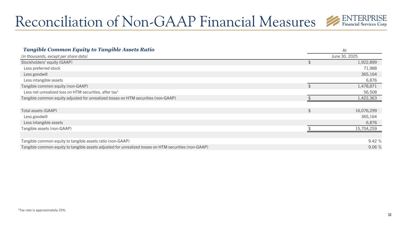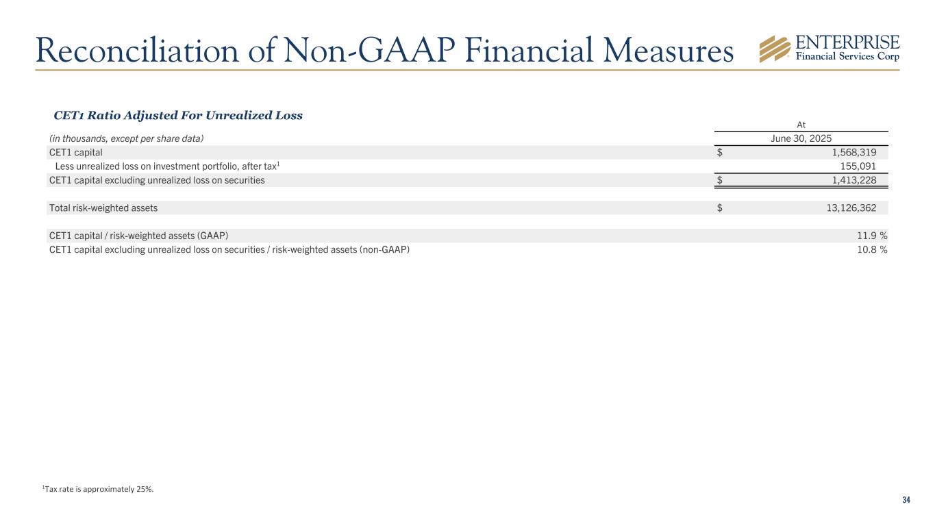 33 At (in thousands, except per share data) June 30, 2025 Stockholders' equity (GAAP) $ 1,922,899 Less preferred stock 71,988 Less goodwill 365,164 Less intangible assets 6,876 Tangible common equity (non-GAAP) $ 1,478,871 Less net unrealized loss on HTM securities, after tax1 56,508 Tangible common equity adjusted for unrealized losses on HTM securities (non-GAAP) $ 1,422,363 Total assets (GAAP) $ 16,076,299 Less goodwill 365,164 Less intangible assets 6,876 Tangible assets (non-GAAP) $ 15,704,259 Tangible common equity to tangible assets ratio (non-GAAP) 9.42 % Tangible common equity to tangible assets adjusted for unrealized losses on HTM securities (non-GAAP) 9.06 % 1Tax rate is approximately 25%. Tangible Common Equity to Tangible Assets Ratio Reconciliation of Non-GAAP Financial Measures