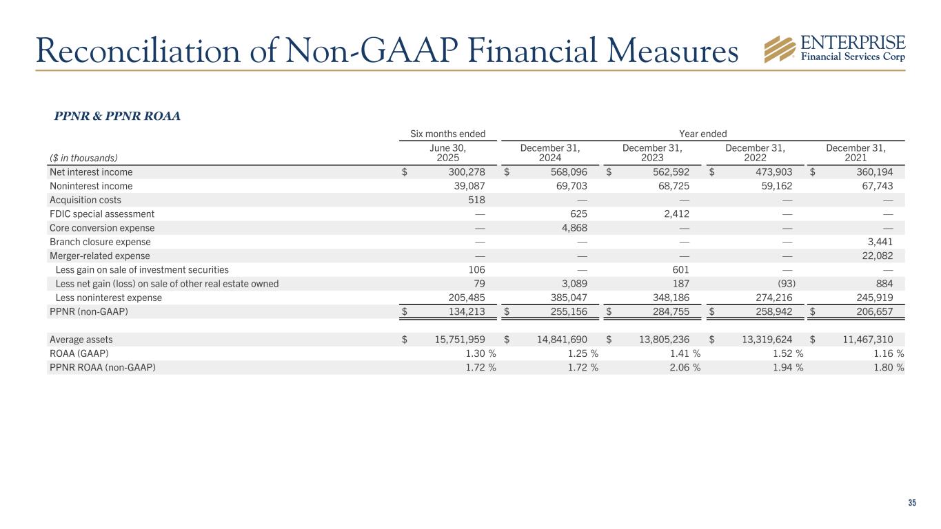 34 At (in thousands, except per share data) June 30, 2025 CET1 capital $ 1,568,319 Less unrealized loss on investment portfolio, after tax1 155,091 CET1 capital excluding unrealized loss on securities $ 1,413,228 Total risk-weighted assets $ 13,126,362 CET1 capital / risk-weighted assets (GAAP) 11.9 % CET1 capital excluding unrealized loss on securities / risk-weighted assets (non-GAAP) 10.8 % CET1 Ratio Adjusted For Unrealized Loss Reconciliation of Non-GAAP Financial Measures 1Tax rate is approximately 25%.