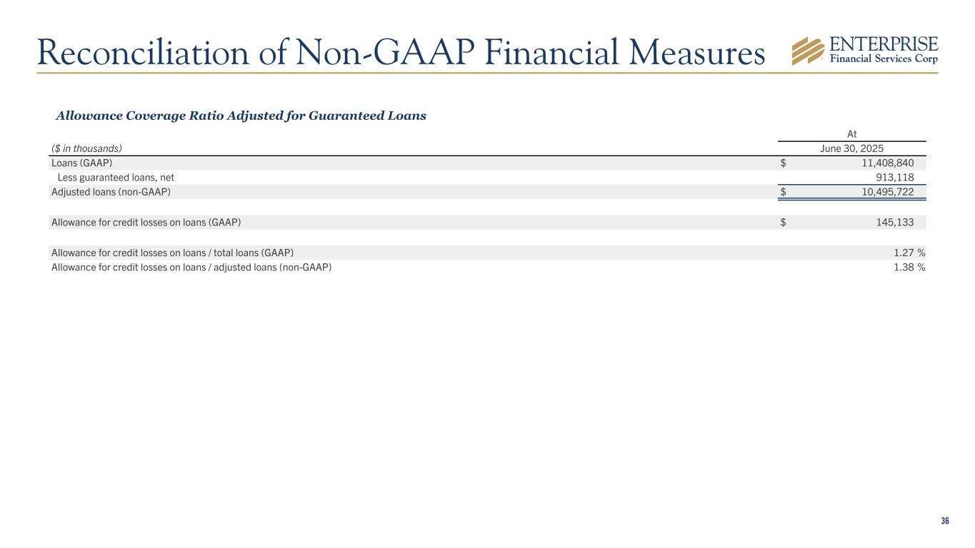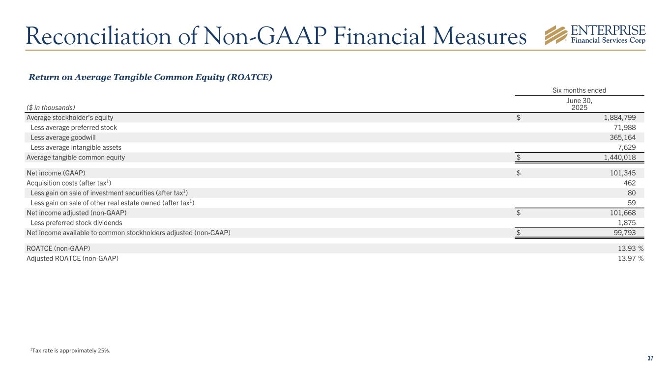 36 Allowance Coverage Ratio Adjusted for Guaranteed Loans At ($ in thousands) June 30, 2025 Loans (GAAP) $ 11,408,840 Less guaranteed loans, net 913,118 Adjusted loans (non-GAAP) $ 10,495,722 Allowance for credit losses on loans (GAAP) $ 145,133 Allowance for credit losses on loans / total loans (GAAP) 1.27 % Allowance for credit losses on loans / adjusted loans (non-GAAP) 1.38 % Reconciliation of Non-GAAP Financial Measures