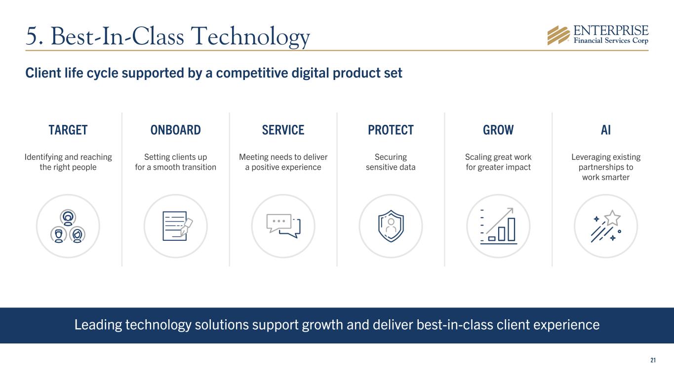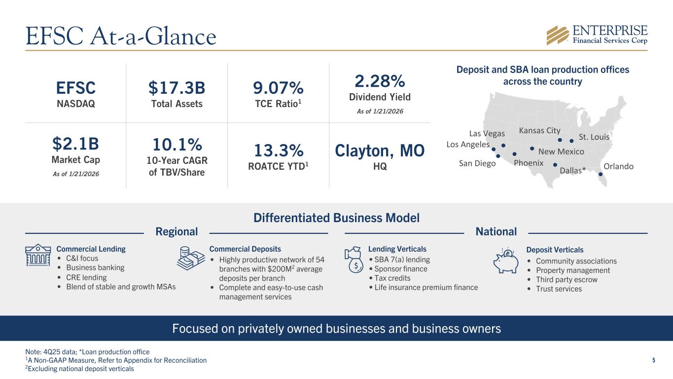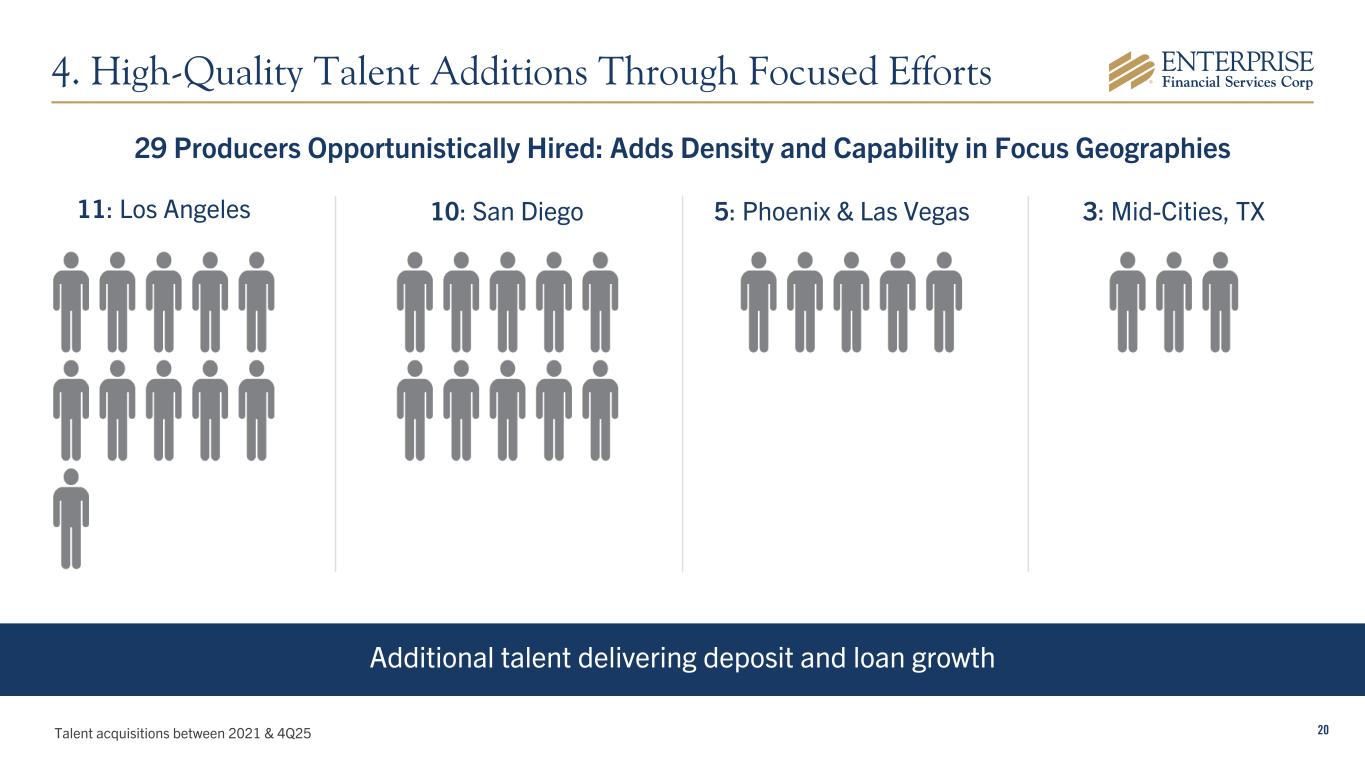 20 Additional talent delivering deposit and loan growth Talent acquisitions between 2021 & 4Q25 4. High-Quality Talent Additions Through Focused Efforts 11: Los Angeles 10: San Diego 5: Phoenix & Las Vegas 29 Producers Opportunistically Hired: Adds Density and Capability in Focus Geographies 3: Mid-Cities, TX