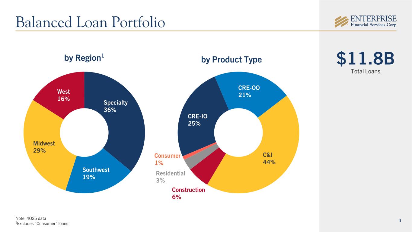 7 $14.6B Total Deposits Note: 4Q25 data Interest- Bearing Demand Accounts by Typeby Region Deposit Verticals 26% Southwest 18% Midwest 47% West 9% DDA 33% MMA & Savings 31% CD 12% Interest-Bearing Demand Accounts 24% Diversified Deposit Base