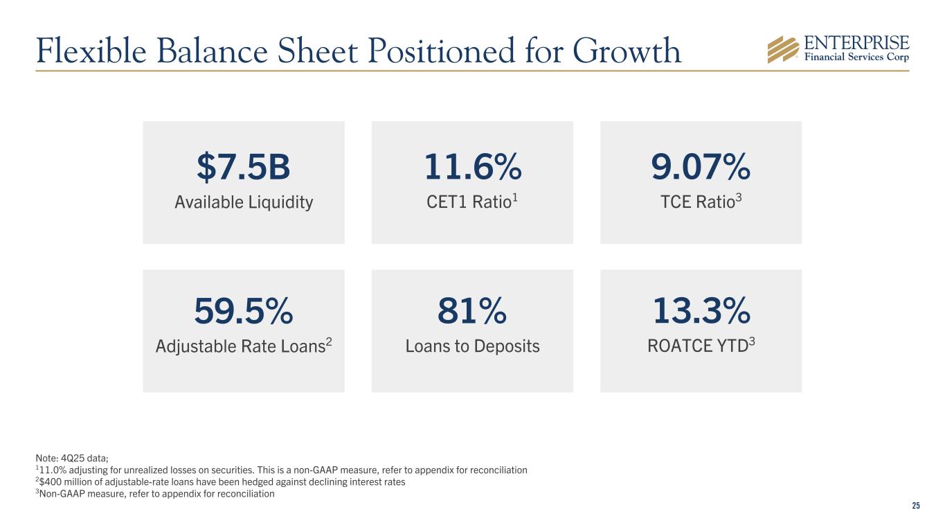 24 Loan & Deposits Trends ($B) $2.8 $11.8 $2.8 $14.6 EFSC Loans EFSC Deposits 2015 2025 Balance sheet growth driving earnings growth 10-Year TBV CAGR510-Year TTM4 EPS CAGR5 110-Year CAGR from 4Q15 – 4Q25; 29.7% excluding acquisitions; 311.9% excluding acquisitions and brokered CDs 4TTM – Trailing Twelve Months; 54Q25 results for the KRX index available as of January 21, 2026. All figures are as reported by S&P. 10-Year CAGR1 Loans2: 15.7% Deposits3: 18.0% 5.0% 9.1% 10.9% KRX Median KRX Top Quartile EFSC 6.5% 10.0% 10.1% KRX Median KRX Top Quartile EFSC Consistently Growing and Creating Value