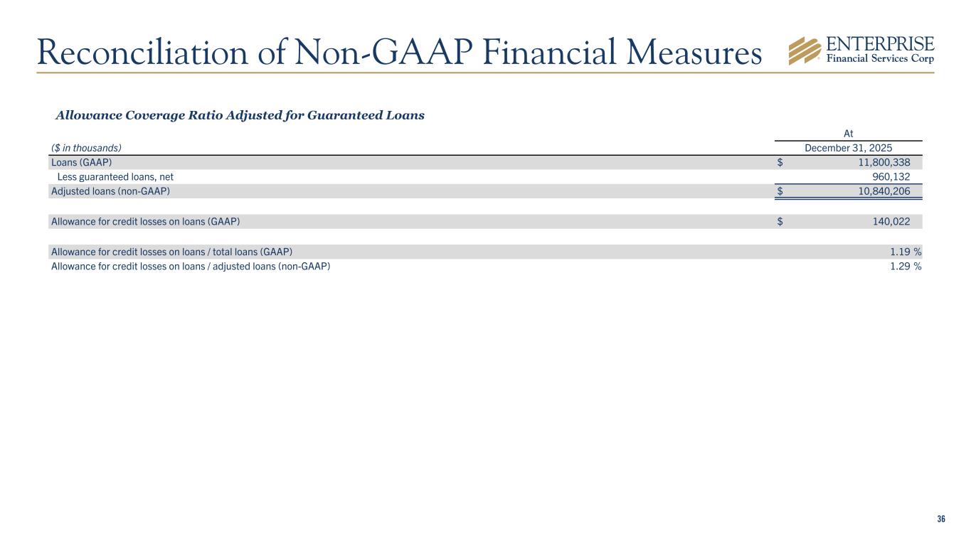 36 Allowance Coverage Ratio Adjusted for Guaranteed Loans At ($ in thousands) December 31, 2025 Loans (GAAP) $ 11,800,338 Less guaranteed loans, net 960,132 Adjusted loans (non-GAAP) $ 10,840,206 Allowance for credit losses on loans (GAAP) $ 140,022 Allowance for credit losses on loans / total loans (GAAP) 1.19 % Allowance for credit losses on loans / adjusted loans (non-GAAP) 1.29 % Reconciliation of Non-GAAP Financial Measures
