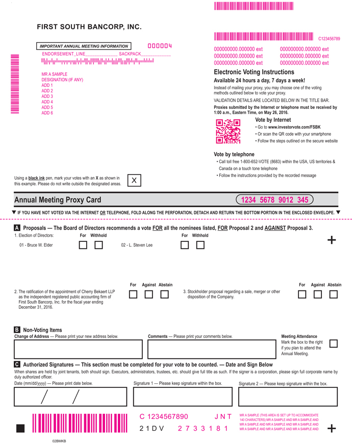 We are enclosing a copy of First South Bancorp, Inc.’s 2015 Annual Report with this proxy statement.