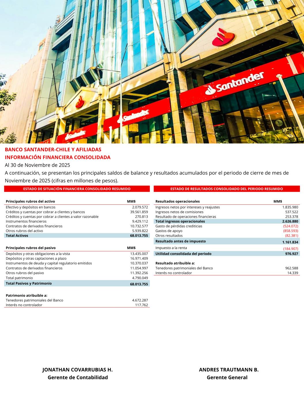 SUMMARIZED CONSOLIDATED STATEMENTS OF FINANCIAL POSITION SUMMARIZED CONSOLIDATED STATEMENTS OF INCOME FOR THE PERIOD Principal assets MCh$ Operational results MCh$ Cash and deposits in banks 2,079,572 Net interest income 1,835,980 Loans and accounts receivables from customers and banks, net 39,561,859 Net fee and commission income 537,522 Loans and accounts receivables from customers at fair value, net 270,813 Result from financial operations 253,378 Financial instruments 9,429,112 Total operating income 2,626,880 Financial derivative contracts 10,732,577 Provision for loan losses (524,072) Other asset ítems 5,939,822 Support expenses (858,593) Total assets 68,013,755 Other results (82,381) Income before tax 1,161,834 Principal liabilities MCh$ Income tax expense (184,907) Deposits and other demand liabilities 13,435,007 Net income for the period 976,927 Time deposits and other time liabilities 16,971,409 Issued debt and regulatory capital instruments 10,370,037 Attributable to: Financial derivative contracts 11,054,997 Equity holders of the Bank 962,588 Other liabilities ítems 11,392,256 Non-controlling interest 14,339 Total equity 4,790,049 Total liabilities and Equity 68,013,755 Equity attributable to: Equity holders of the Bank 4,672,287 Non-controlling interest 117,762 BANCO SANTANDER-CHILE AND SUBSIDIARIES CONSOLIDATED FINANCIAL INFORMATION As of November 30, 2025 The principal balances and results accumulated for the period ending November 2025 (amounts in millions of Chilean pesos). JONATHAN COVARRUBIAS H. ANDRES TRAUTMANN B. Chief Accounting Officer Chief Executive Officer