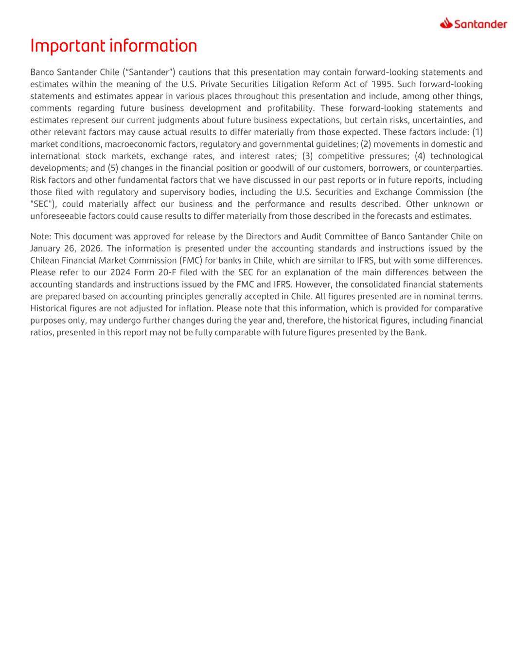 Important information Banco Santander Chile (“Santander”) cautions that this presentation may contain forward-looking statements and estimates within the meaning of the U.S. Private Securities Litigation Reform Act of 1995. Such forward-looking statements and estimates appear in various places throughout this presentation and include, among other things, comments regarding future business development and profitability. These forward-looking statements and estimates represent our current judgments about future business expectations, but certain risks, uncertainties, and other relevant factors may cause actual results to differ materially from those expected. These factors include: (1) market conditions, macroeconomic factors, regulatory and governmental guidelines; (2) movements in domestic and international stock markets, exchange rates, and interest rates; (3) competitive pressures; (4) technological developments; and (5) changes in the financial position or goodwill of our customers, borrowers, or counterparties. Risk factors and other fundamental factors that we have discussed in our past reports or in future reports, including those filed with regulatory and supervisory bodies, including the U.S. Securities and Exchange Commission (the "SEC"), could materially affect our business and the performance and results described. Other unknown or unforeseeable factors could cause results to differ materially from those described in the forecasts and estimates. Note: This document was approved for release by the Directors and Audit Committee of Banco Santander Chile on January 26, 2026. The information is presented under the accounting standards and instructions issued by the Chilean Financial Market Commission (FMC) for banks in Chile, which are similar to IFRS, but with some differences. Please refer to our 2024 Form 20-F filed with the SEC for an explanation of the main differences between the accounting standards and instructions issued by the FMC and IFRS. However, the consolidated financial statements are prepared based on accounting principles generally accepted in Chile. All figures presented are in nominal terms. Historical figures are not adjusted for inflation. Please note that this information, which is provided for comparative purposes only, may undergo further changes during the year and, therefore, the historical figures, including financial ratios, presented in this report may not be fully comparable with future figures presented by the Bank.