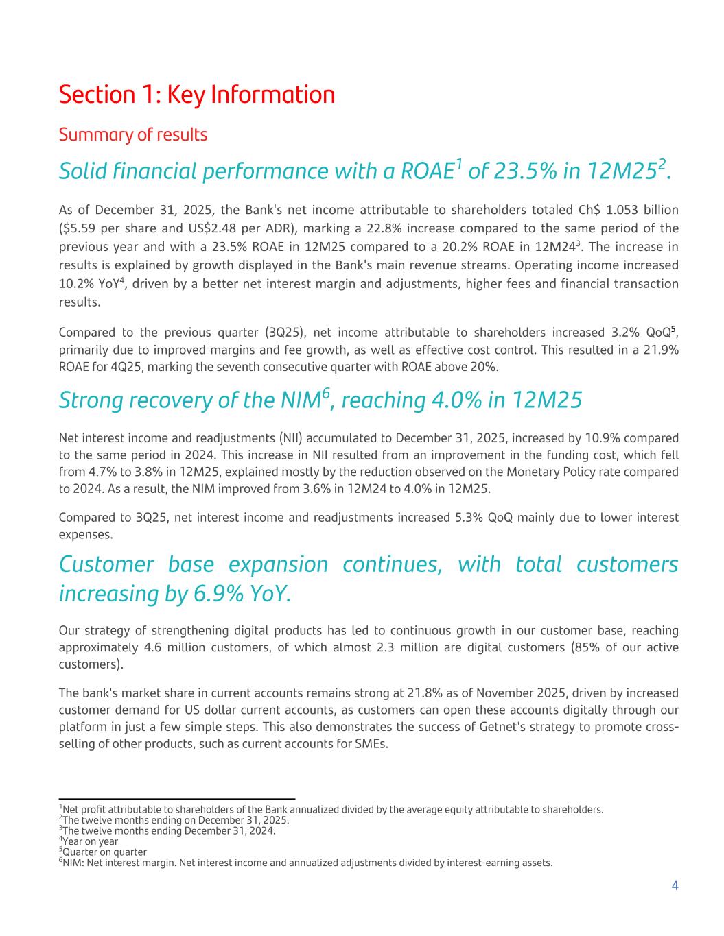 Section 1: Key Information Summary of results Solid financial performance with a ROAE1 of 23.5% in 12M252. As of December 31, 2025, the Bank's net income attributable to shareholders totaled Ch$ 1.053 billion ($5.59 per share and US$2.48 per ADR), marking a 22.8% increase compared to the same period of the previous year and with a 23.5% ROAE in 12M25 compared to a 20.2% ROAE in 12M243. The increase in results is explained by growth displayed in the Bank's main revenue streams. Operating income increased 10.2% YoY4, driven by a better net interest margin and adjustments, higher fees and financial transaction results. Compared to the previous quarter (3Q25), net income attributable to shareholders increased 3.2% QoQ5, primarily due to improved margins and fee growth, as well as effective cost control. This resulted in a 21.9% ROAE for 4Q25, marking the seventh consecutive quarter with ROAE above 20%. Strong recovery of the NIM6, reaching 4.0% in 12M25 Net interest income and readjustments (NII) accumulated to December 31, 2025, increased by 10.9% compared to the same period in 2024. This increase in NII resulted from an improvement in the funding cost, which fell from 4.7% to 3.8% in 12M25, explained mostly by the reduction observed on the Monetary Policy rate compared to 2024. As a result, the NIM improved from 3.6% in 12M24 to 4.0% in 12M25. Compared to 3Q25, net interest income and readjustments increased 5.3% QoQ mainly due to lower interest expenses. Customer base expansion continues, with total customers increasing by 6.9% YoY. Our strategy of strengthening digital products has led to continuous growth in our customer base, reaching approximately 4.6 million customers, of which almost 2.3 million are digital customers (85% of our active customers). The bank's market share in current accounts remains strong at 21.8% as of November 2025, driven by increased customer demand for US dollar current accounts, as customers can open these accounts digitally through our platform in just a few simple steps. This also demonstrates the success of Getnet's strategy to promote cross- selling of other products, such as current accounts for SMEs. 4 1Net profit attributable to shareholders of the Bank annualized divided by the average equity attributable to shareholders. 2The twelve months ending on December 31, 2025. 3The twelve months ending December 31, 2024. 4Year on year 5Quarter on quarter 6NIM: Net interest margin. Net interest income and annualized adjustments divided by interest-earning assets.