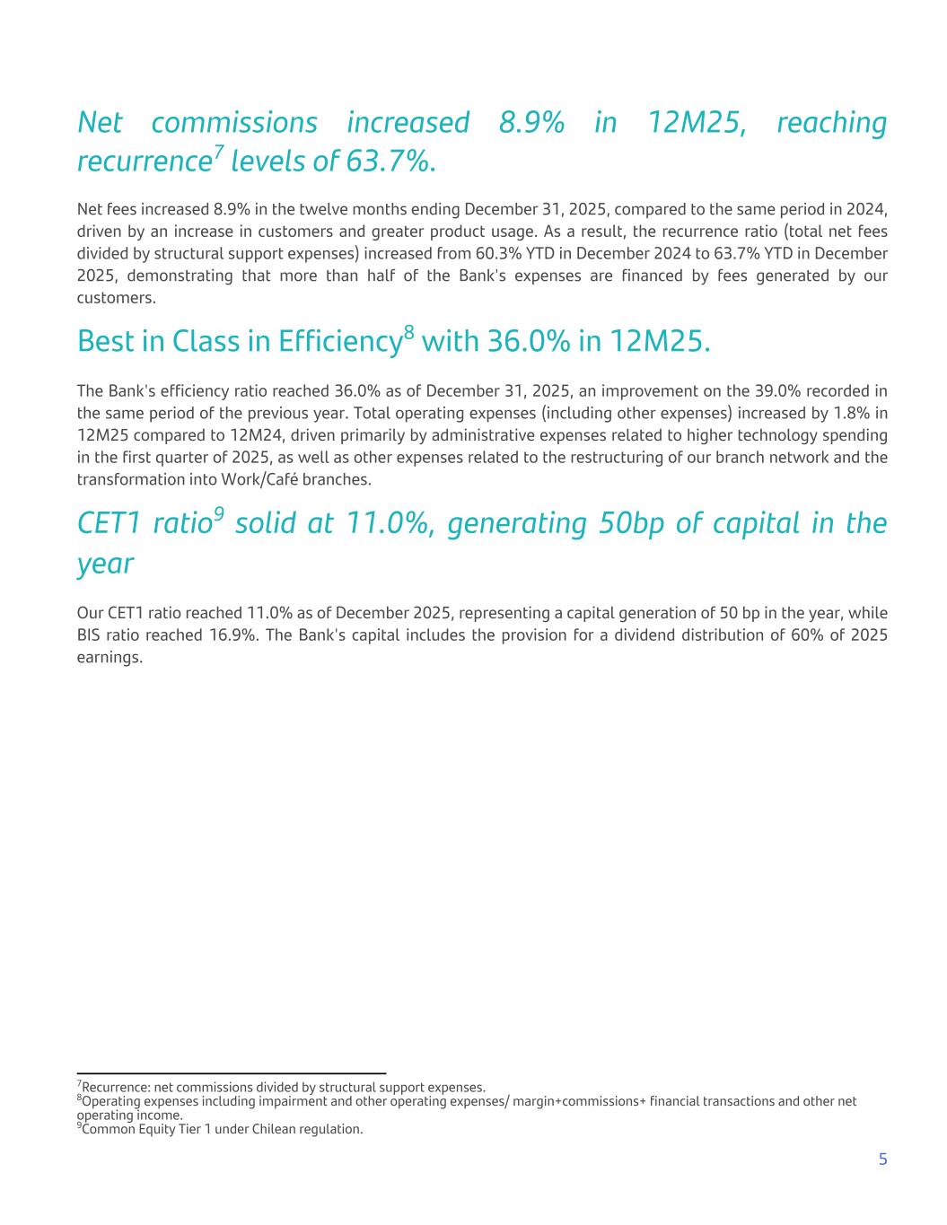 Net commissions increased 8.9% in 12M25, reaching recurrence7 levels of 63.7%. Net fees increased 8.9% in the twelve months ending December 31, 2025, compared to the same period in 2024, driven by an increase in customers and greater product usage. As a result, the recurrence ratio (total net fees divided by structural support expenses) increased from 60.3% YTD in December 2024 to 63.7% YTD in December 2025, demonstrating that more than half of the Bank's expenses are financed by fees generated by our customers. Best in Class in Efficiency8 with 36.0% in 12M25. The Bank's efficiency ratio reached 36.0% as of December 31, 2025, an improvement on the 39.0% recorded in the same period of the previous year. Total operating expenses (including other expenses) increased by 1.8% in 12M25 compared to 12M24, driven primarily by administrative expenses related to higher technology spending in the first quarter of 2025, as well as other expenses related to the restructuring of our branch network and the transformation into Work/Café branches. CET1 ratio9 solid at 11.0%, generating 50bp of capital in the year Our CET1 ratio reached 11.0% as of December 2025, representing a capital generation of 50 bp in the year, while BIS ratio reached 16.9%. The Bank's capital includes the provision for a dividend distribution of 60% of 2025 earnings. 5 7Recurrence: net commissions divided by structural support expenses. 8Operating expenses including impairment and other operating expenses/ margin+commissions+ financial transactions and other net operating income. 9Common Equity Tier 1 under Chilean regulation.