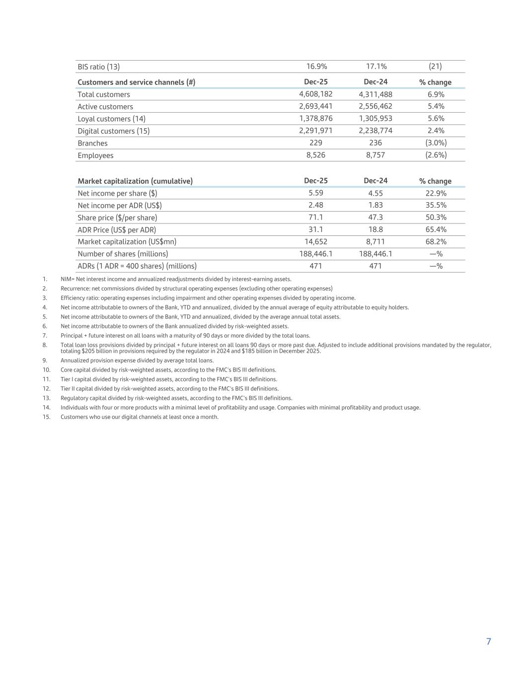 BIS ratio (13) 16.9% 17.1% (21) Customers and service channels (#) Dec-25 Dec-24 % change Total customers 4,608,182 4,311,488 6.9% Active customers 2,693,441 2,556,462 5.4% Loyal customers (14) 1,378,876 1,305,953 5.6% Digital customers (15) 2,291,971 2,238,774 2.4% Branches 229 236 (3.0%) Employees 8,526 8,757 (2.6%) Market capitalization (cumulative) Dec-25 Dec-24 % change Net income per share ($) 5.59 4.55 22.9% Net income per ADR (US$) 2.48 1.83 35.5% Share price ($/per share) 71.1 47.3 50.3% ADR Price (US$ per ADR) 31.1 18.8 65.4% Market capitalization (US$mn) 14,652 8,711 68.2% Number of shares (millions) 188,446.1 188,446.1 —% ADRs (1 ADR = 400 shares) (millions) 471 471 —% 1. NIM= Net interest income and annualized readjustments divided by interest-earning assets. 2. Recurrence: net commissions divided by structural operating expenses (excluding other operating expenses) 3. Efficiency ratio: operating expenses including impairment and other operating expenses divided by operating income. 4. Net income attributable to owners of the Bank, YTD and annualized, divided by the annual average of equity attributable to equity holders. 5. Net income attributable to owners of the Bank, YTD and annualized, divided by the average annual total assets. 6. Net income attributable to owners of the Bank annualized divided by risk-weighted assets. 7. Principal + future interest on all loans with a maturity of 90 days or more divided by the total loans. 8. Total loan loss provisions divided by principal + future interest on all loans 90 days or more past due. Adjusted to include additional provisions mandated by the regulator, totaling $205 billion in provisions required by the regulator in 2024 and $185 billion in December 2025. 9. Annualized provision expense divided by average total loans. 10. Core capital divided by risk-weighted assets, according to the FMC's BIS III definitions. 11. Tier I capital divided by risk-weighted assets, according to the FMC's BIS III definitions. 12. Tier II capital divided by risk-weighted assets, according to the FMC's BIS III definitions. 13. Regulatory capital divided by risk-weighted assets, according to the FMC's BIS III definitions. 14. Individuals with four or more products with a minimal level of profitability and usage. Companies with minimal profitability and product usage. 15. Customers who use our digital channels at least once a month. 7