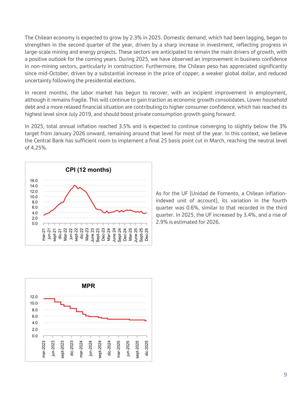 The Chilean economy is expected to grow by 2.3% in 2025. Domestic demand, which had been lagging, began to strengthen in the second quarter of the year, driven by a sharp increase in investment, reflecting progress in large-scale mining and energy projects. These sectors are anticipated to remain the main drivers of growth, with a positive outlook for the coming years. During 2025, we have observed an improvement in business confidence in non-mining sectors, particularly in construction. Furthermore, the Chilean peso has appreciated significantly since mid-October, driven by a substantial increase in the price of copper, a weaker global dollar, and reduced uncertainty following the presidential elections. In recent months, the labor market has begun to recover, with an incipient improvement in employment, although it remains fragile. This will continue to gain traction as economic growth consolidates. Lower household debt and a more relaxed financial situation are contributing to higher consumer confidence, which has reached its highest level since July 2019, and should boost private consumption growth going forward. In 2025, total annual inflation reached 3.5% and is expected to continue converging to slightly below the 3% target from January 2026 onward, remaining around that level for most of the year. In this context, we believe the Central Bank has sufficient room to implement a final 25 basis point cut in March, reaching the neutral level of 4.25%. CPI (12 months) m ar -2 1 ju n- 21 se pt -2 1 di c- 21 M ar -2 2 ju n- 22 se pt -2 2 di c- 22 M ar -2 3 Ju ne 2 3 S ep t-2 3 D ec -2 3 M ar -2 4 Ju ne 2 4 S ep t-2 4 D ec -2 4 M ar -2 5 Ju ne 2 5 S ep t-2 5 D ec -2 5 0.0 2.0 4.0 6.0 8.0 10.0 12.0 14.0 16.0 As for the UF (Unidad de Fomento, a Chilean inflation- indexed unit of account), its variation in the fourth quarter was 0.6%, similar to that recorded in the third quarter. In 2025, the UF increased by 3.4%, and a rise of 2.9% is estimated for 2026. MPR m ar -2 02 3 ju n- 20 23 se pt -2 02 3 di c- 20 23 m ar -2 02 4 ju n- 20 24 se pt -2 02 4 di c- 20 24 m ar -2 02 5 ju n- 20 25 se pt -2 02 5 di c- 20 25 0.0 2.0 4.0 6.0 8.0 10.0 12.0 9