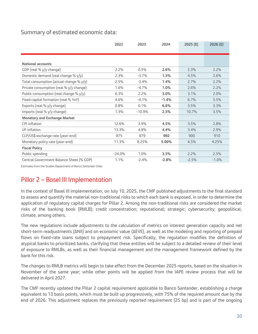 Summary of estimated economic data: 2022 2023 2024 2025 (E) 2026 (E) National accounts GDP (real % y/y change) 2.2% 0.5% 2.6% 2.3% 2.2% Domestic demand (real change % y/y) 2.3% -3.7% 1.3% 4.5% 2.6% Total consumption (actual change % y/y) 2.5% -3.4% 1.4% 2.7% 2.2% Private consumption (real % y/y change) 1.6% -4.7% 1.0% 2.6% 2.2% Public consumption (real change % y/y) 6.3% 2.2% 3.0% 3.1% 2.0% Fixed capital formation (real % YoY) 4.6% -0.1% -1.4% 6.7% 3.5% Exports (real % y/y change) 0.8% 0.1% 6.6% 3.5% 3.3% Imports (real % y/y change) 1.3% -10.9% 2.5% 10.7% 3.5% Monetary and Exchange Market CPI inflation 12.6% 3.9% 4.5% 3.5% 2.8% UF inflation 13.3% 4.8% 4.4% 3.4% 2.9% CLP/US$ exchange rate (year-end) 875 879 992 900 910 Monetary policy rate (year-end) 11.3% 8.25% 5.00% 4.5% 4.25% Fiscal Policy Public spending -24.0% 1.0% 3.5% 2.2% 2.5% Central Government Balance Sheet (% GDP) 1.1% -2.4% -2.8% -2.5% -1.0% Estimates from the Studies Department of Banco Santander Chile. Pillar 2 – Basel III Implementation In the context of Basel III implementation, on July 10, 2025, the CMF published adjustments to the final standard to assess and quantify the material non-traditional risks to which each bank is exposed, in order to determine the application of regulatory capital charges for Pillar 2. Among the non-traditional risks are considered the market risks of the banking book (RMLB); credit concentration; reputational; strategic; cybersecurity; geopolitical, climate, among others. The new regulations include adjustments to the calculation of metrics on interest generation capacity and net short-term readjustments (ΔNII) and on economic value (ΔEVE), as well as the modeling and reporting of prepaid flows on fixed-rate loans subject to prepayment risk. Specifically, the regulation modifies the definition of atypical banks to prioritized banks, clarifying that these entities will be subject to a detailed review of their level of exposure to RMLBs, as well as their financial management and the management framework defined by the bank for this risk. The changes to RMLB metrics will begin to take effect from the December 2025 reports, based on the situation in November of the same year; while other points will be applied from the IAPE review process that will be delivered in April 2027. The CMF recently updated the Pillar 2 capital requirement applicable to Banco Santander, establishing a charge equivalent to 13 basis points, which must be built up progressively, with 75% of the required amount due by the end of 2026. This adjustment replaces the previously reported requirement (25 bp) and is part of the ongoing 10