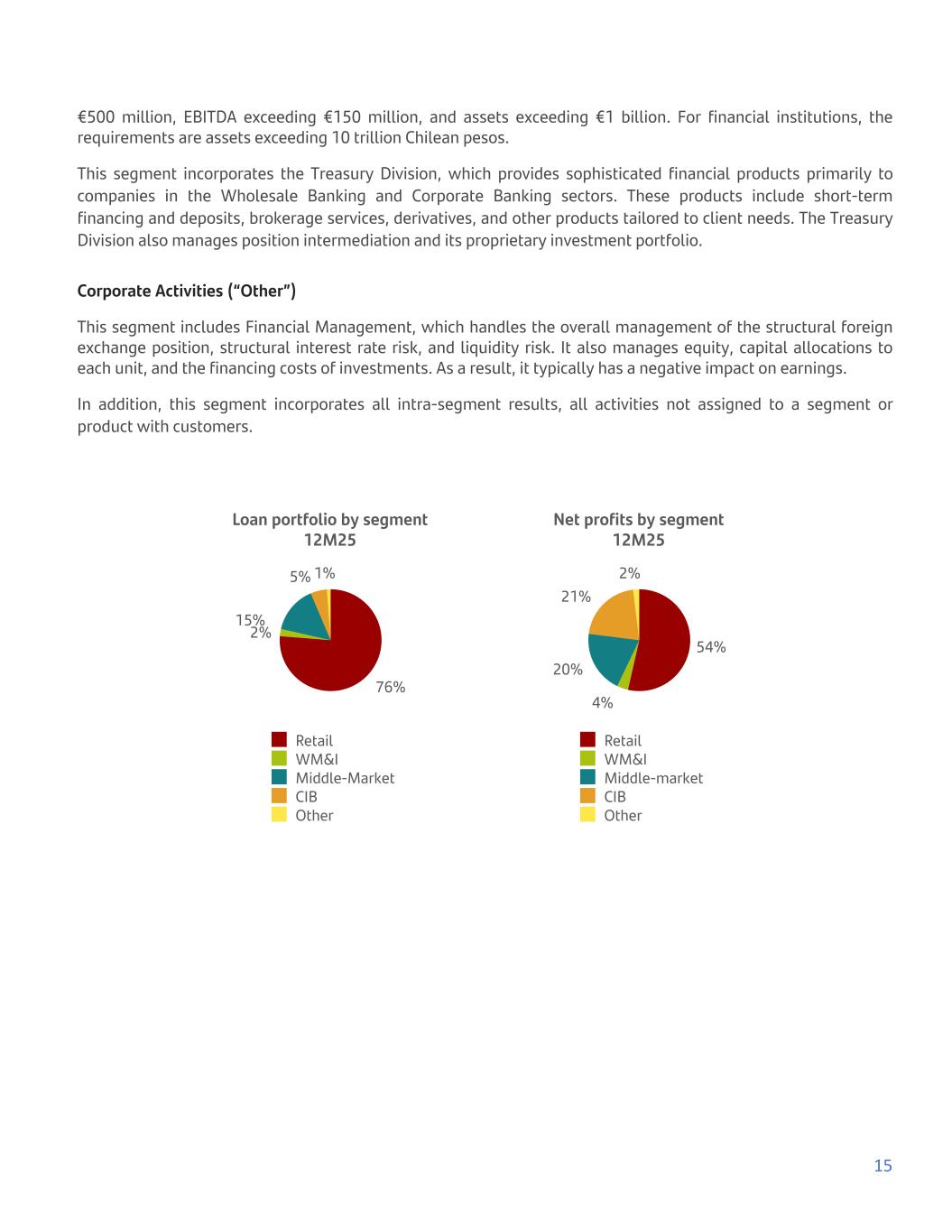 €500 million, EBITDA exceeding €150 million, and assets exceeding €1 billion. For financial institutions, the requirements are assets exceeding 10 trillion Chilean pesos. This segment incorporates the Treasury Division, which provides sophisticated financial products primarily to companies in the Wholesale Banking and Corporate Banking sectors. These products include short-term financing and deposits, brokerage services, derivatives, and other products tailored to client needs. The Treasury Division also manages position intermediation and its proprietary investment portfolio. Corporate Activities (“Other”) This segment includes Financial Management, which handles the overall management of the structural foreign exchange position, structural interest rate risk, and liquidity risk. It also manages equity, capital allocations to each unit, and the financing costs of investments. As a result, it typically has a negative impact on earnings. In addition, this segment incorporates all intra-segment results, all activities not assigned to a segment or product with customers. Loan portfolio by segment 12M25 76% 2% 15% 5% 1% Retail WM&I Middle-Market CIB Other Net profits by segment 12M25 54% 4% 20% 21% 2% Retail WM&I Middle-market CIB Other 15