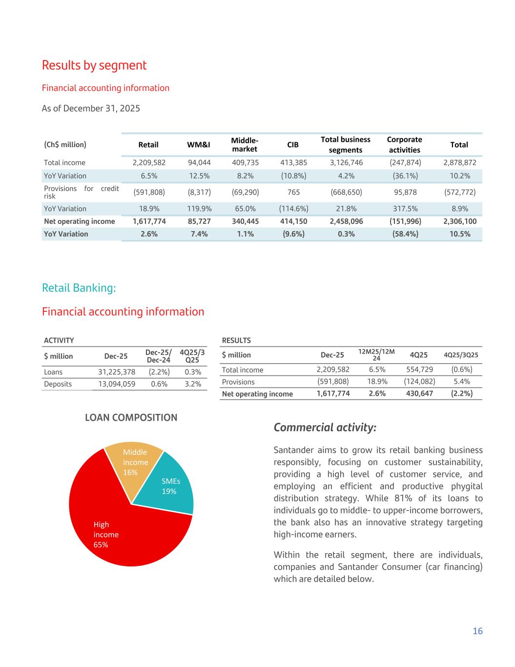 Results by segment Financial accounting information As of December 31, 2025 (Ch$ million) Retail WM&I Middle- market CIB Total business segments Corporate activities Total Total income 2,209,582 94,044 409,735 413,385 3,126,746 (247,874) 2,878,872 YoY Variation 6.5% 12.5% 8.2% (10.8%) 4.2% (36.1%) 10.2% Provisions for credit risk (591,808) (8,317) (69,290) 765 (668,650) 95,878 (572,772) YoY Variation 18.9% 119.9% 65.0% (114.6%) 21.8% 317.5% 8.9% Net operating income 1,617,774 85,727 340,445 414,150 2,458,096 (151,996) 2,306,100 YoY Variation 2.6% 7.4% 1.1% (9.6%) 0.3% (58.4%) 10.5% Retail Banking: Financial accounting information ACTIVITY $ million Dec-25 Dec-25/ Dec-24 4Q25/3 Q25 Loans 31,225,378 (2.2%) 0.3% Deposits 13,094,059 0.6% 3.2% RESULTS $ million Dec-25 12M25/12M 24 4Q25 4Q25/3Q25 Total income 2,209,582 6.5% 554,729 (0.6%) Provisions (591,808) 18.9% (124,082) 5.4% Net operating income 1,617,774 2.6% 430,647 (2.2%) LOAN COMPOSITION High income 65% Middle income 16% SMEs 19% Commercial activity: Santander aims to grow its retail banking business responsibly, focusing on customer sustainability, providing a high level of customer service, and employing an efficient and productive phygital distribution strategy. While 81% of its loans to individuals go to middle- to upper-income borrowers, the bank also has an innovative strategy targeting high-income earners. Within the retail segment, there are individuals, companies and Santander Consumer (car financing) which are detailed below. 16