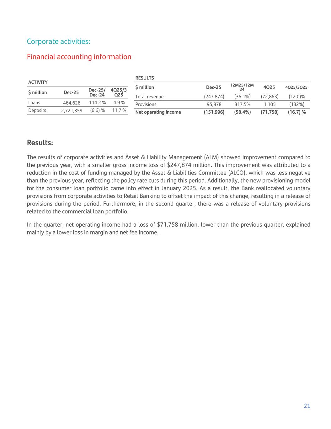 Corporate activities: Financial accounting information ACTIVITY $ million Dec-25 Dec-25/ Dec-24 4Q25/3 Q25 Loans 464,626 114.2 % 4.9 % Deposits 2,721,359 (6.6) % 11.7 % RESULTS $ million Dec-25 12M25/12M 24 4Q25 4Q25/3Q25 Total revenue (247,874) (36.1%) (72,863) (12.0)% Provisions 95,878 317.5% 1,105 (132%) Net operating income (151,996) (58.4%) (71,758) (16.7) % Results: The results of corporate activities and Asset & Liability Management (ALM) showed improvement compared to the previous year, with a smaller gross income loss of $247,874 million. This improvement was attributed to a reduction in the cost of funding managed by the Asset & Liabilities Committee (ALCO), which was less negative than the previous year, reflecting the policy rate cuts during this period. Additionally, the new provisioning model for the consumer loan portfolio came into effect in January 2025. As a result, the Bank reallocated voluntary provisions from corporate activities to Retail Banking to offset the impact of this change, resulting in a release of provisions during the period. Furthermore, in the second quarter, there was a release of voluntary provisions related to the commercial loan portfolio. In the quarter, net operating income had a loss of $71.758 million, lower than the previous quarter, explained mainly by a lower loss in margin and net fee income. 21