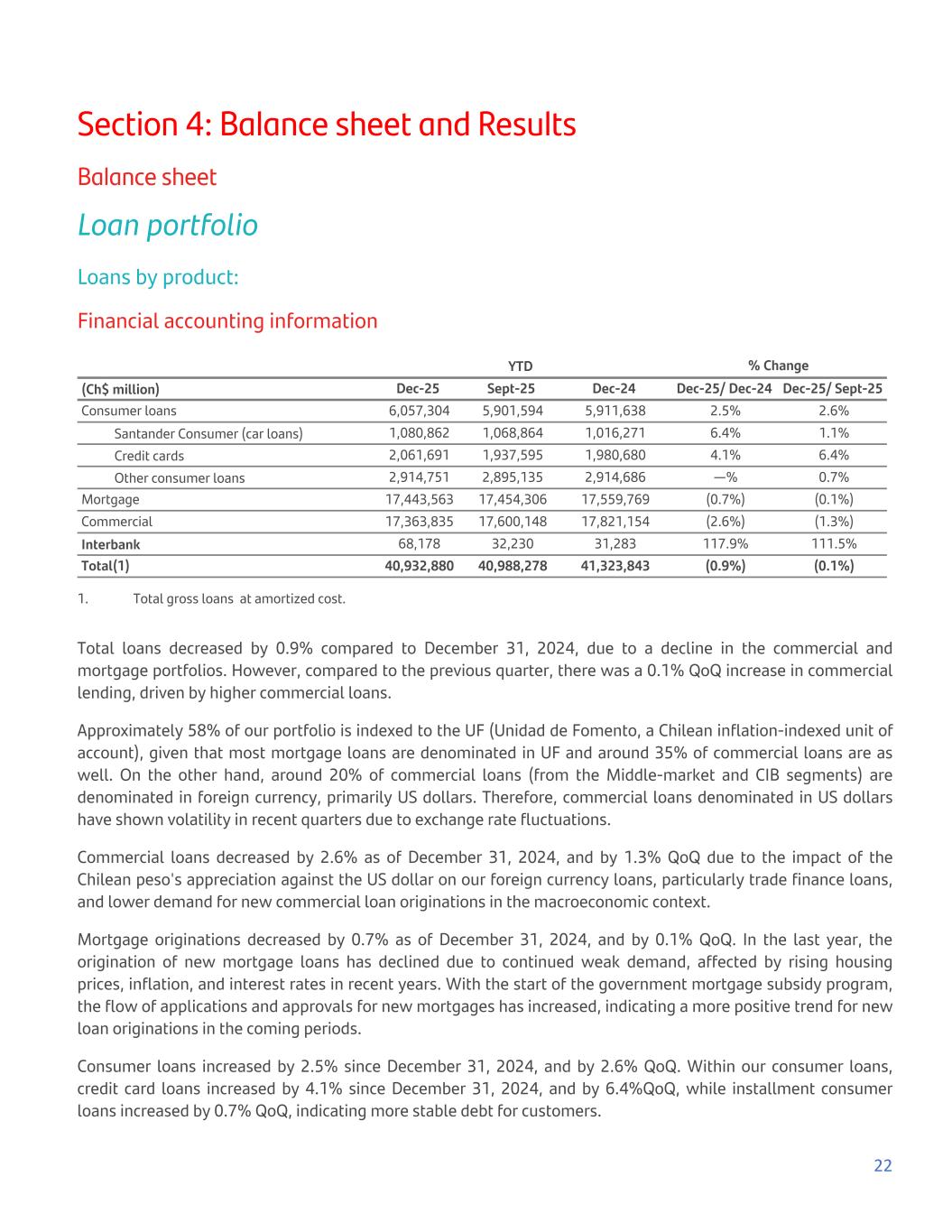 Section 4: Balance sheet and Results Balance sheet Loan portfolio Loans by product: Financial accounting information YTD % Change (Ch$ million) Dec-25 Sept-25 Dec-24 Dec-25/ Dec-24 Dec-25/ Sept-25 Consumer loans 6,057,304 5,901,594 5,911,638 2.5% 2.6% Santander Consumer (car loans) 1,080,862 1,068,864 1,016,271 6.4% 1.1% Credit cards 2,061,691 1,937,595 1,980,680 4.1% 6.4% Other consumer loans 2,914,751 2,895,135 2,914,686 —% 0.7% Mortgage 17,443,563 17,454,306 17,559,769 (0.7%) (0.1%) Commercial 17,363,835 17,600,148 17,821,154 (2.6%) (1.3%) Interbank 68,178 32,230 31,283 117.9% 111.5% Total(1) 40,932,880 40,988,278 41,323,843 (0.9%) (0.1%) 1. Total gross loans at amortized cost. Total loans decreased by 0.9% compared to December 31, 2024, due to a decline in the commercial and mortgage portfolios. However, compared to the previous quarter, there was a 0.1% QoQ increase in commercial lending, driven by higher commercial loans. Approximately 58% of our portfolio is indexed to the UF (Unidad de Fomento, a Chilean inflation-indexed unit of account), given that most mortgage loans are denominated in UF and around 35% of commercial loans are as well. On the other hand, around 20% of commercial loans (from the Middle-market and CIB segments) are denominated in foreign currency, primarily US dollars. Therefore, commercial loans denominated in US dollars have shown volatility in recent quarters due to exchange rate fluctuations. Commercial loans decreased by 2.6% as of December 31, 2024, and by 1.3% QoQ due to the impact of the Chilean peso's appreciation against the US dollar on our foreign currency loans, particularly trade finance loans, and lower demand for new commercial loan originations in the macroeconomic context. Mortgage originations decreased by 0.7% as of December 31, 2024, and by 0.1% QoQ. In the last year, the origination of new mortgage loans has declined due to continued weak demand, affected by rising housing prices, inflation, and interest rates in recent years. With the start of the government mortgage subsidy program, the flow of applications and approvals for new mortgages has increased, indicating a more positive trend for new loan originations in the coming periods. Consumer loans increased by 2.5% since December 31, 2024, and by 2.6% QoQ. Within our consumer loans, credit card loans increased by 4.1% since December 31, 2024, and by 6.4%QoQ, while installment consumer loans increased by 0.7% QoQ, indicating more stable debt for customers. 22
