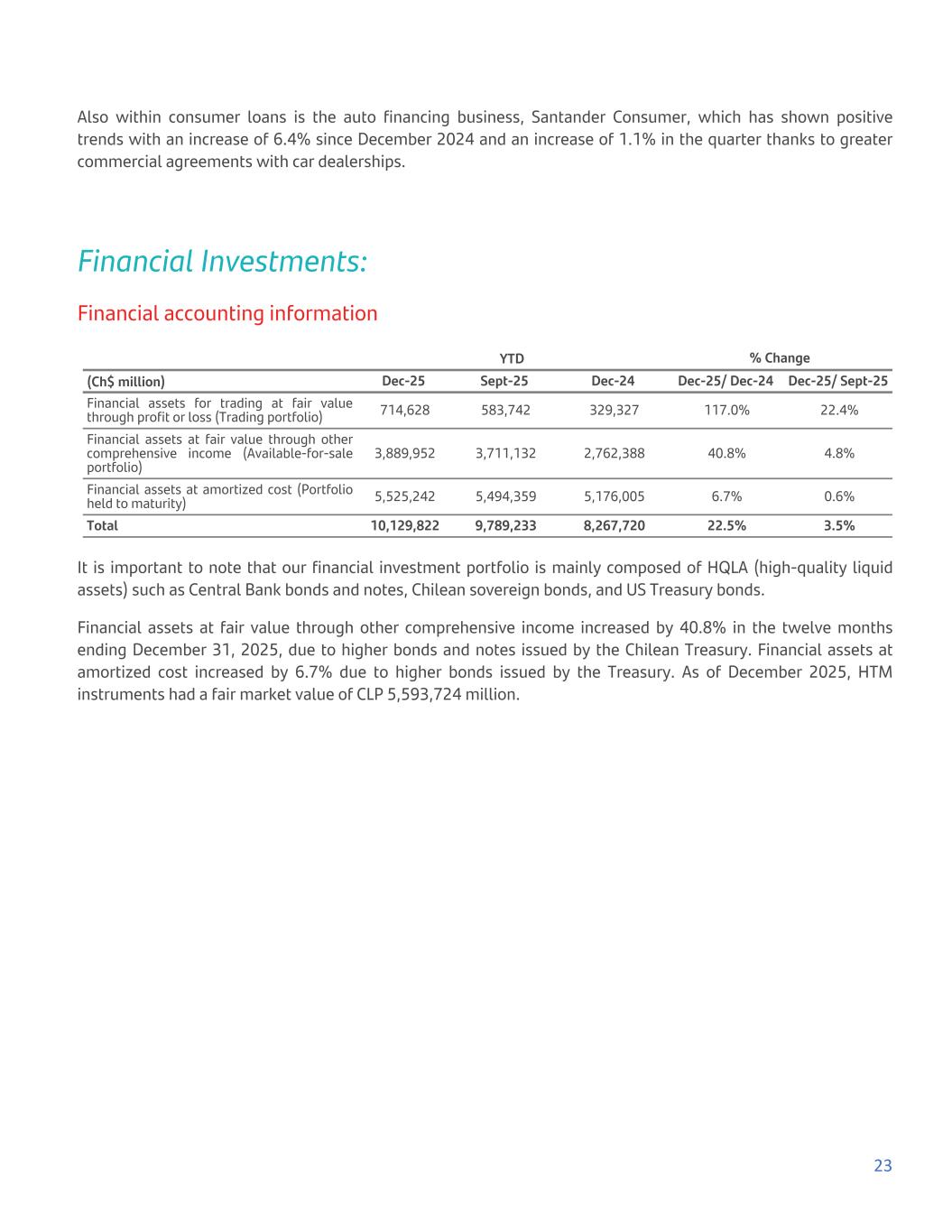 Also within consumer loans is the auto financing business, Santander Consumer, which has shown positive trends with an increase of 6.4% since December 2024 and an increase of 1.1% in the quarter thanks to greater commercial agreements with car dealerships. Financial Investments: Financial accounting information YTD % Change (Ch$ million) Dec-25 Sept-25 Dec-24 Dec-25/ Dec-24 Dec-25/ Sept-25 Financial assets for trading at fair value through profit or loss (Trading portfolio) 714,628 583,742 329,327 117.0% 22.4% Financial assets at fair value through other comprehensive income (Available-for-sale portfolio) 3,889,952 3,711,132 2,762,388 40.8% 4.8% Financial assets at amortized cost (Portfolio held to maturity) 5,525,242 5,494,359 5,176,005 6.7% 0.6% Total 10,129,822 9,789,233 8,267,720 22.5% 3.5% It is important to note that our financial investment portfolio is mainly composed of HQLA (high-quality liquid assets) such as Central Bank bonds and notes, Chilean sovereign bonds, and US Treasury bonds. Financial assets at fair value through other comprehensive income increased by 40.8% in the twelve months ending December 31, 2025, due to higher bonds and notes issued by the Chilean Treasury. Financial assets at amortized cost increased by 6.7% due to higher bonds issued by the Treasury. As of December 2025, HTM instruments had a fair market value of CLP 5,593,724 million. 23