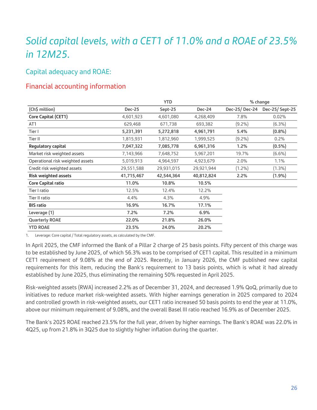 Solid capital levels, with a CET1 of 11.0% and a ROAE of 23.5% in 12M25. Capital adequacy and ROAE: Financial accounting information YTD % change (Ch$ million) Dec-25 Sept-25 Dec-24 Dec-25/ Dec-24 Dec-25/ Sept-25 Core Capital (CET1) 4,601,923 4,601,080 4,268,409 7.8% 0.02% AT1 629,468 671,738 693,382 (9.2%) (6.3%) Tier I 5,231,391 5,272,818 4,961,791 5.4% (0.8%) Tier II 1,815,931 1,812,960 1,999,525 (9.2%) 0.2% Regulatory capital 7,047,322 7,085,778 6,961,316 1.2% (0.5%) Market risk weighted assets 7,143,966 7,648,752 5,967,201 19.7% (6.6%) Operational risk weighted assets 5,019,913 4,964,597 4,923,679 2.0% 1.1% Credit risk weighted assets 29,551,588 29,931,015 29,921,944 (1.2%) (1.3%) Risk weighted assets 41,715,467 42,544,364 40,812,824 2.2% (1.9%) Core Capital ratio 11.0% 10.8% 10.5% Tier I ratio 12.5% 12.4% 12.2% Tier II ratio 4.4% 4.3% 4.9% BIS ratio 16.9% 16.7% 17.1% Leverage (1) 7.2% 7.2% 6.9% Quarterly ROAE 22.0% 21.8% 26.0% YTD ROAE 23.5% 24.0% 20.2% 1. Leverage: Core capital / Total regulatory assets, as calculated by the CMF. In April 2025, the CMF informed the Bank of a Pillar 2 charge of 25 basis points. Fifty percent of this charge was to be established by June 2025, of which 56.3% was to be comprised of CET1 capital. This resulted in a minimum CET1 requirement of 9.08% at the end of 2025. Recently, in January 2026, the CMF published new capital requirements for this item, reducing the Bank's requirement to 13 basis points, which is what it had already established by June 2025, thus eliminating the remaining 50% requested in April 2025. Risk-weighted assets (RWA) increased 2.2% as of December 31, 2024, and decreased 1.9% QoQ, primarily due to initiatives to reduce market risk-weighted assets. With higher earnings generation in 2025 compared to 2024 and controlled growth in risk-weighted assets, our CET1 ratio increased 50 basis points to end the year at 11.0%, above our minimum requirement of 9.08%, and the overall Basel III ratio reached 16.9% as of December 2025. The Bank's 2025 ROAE reached 23.5% for the full year, driven by higher earnings. The Bank's ROAE was 22.0% in 4Q25, up from 21.8% in 3Q25 due to slightly higher inflation during the quarter. 26
