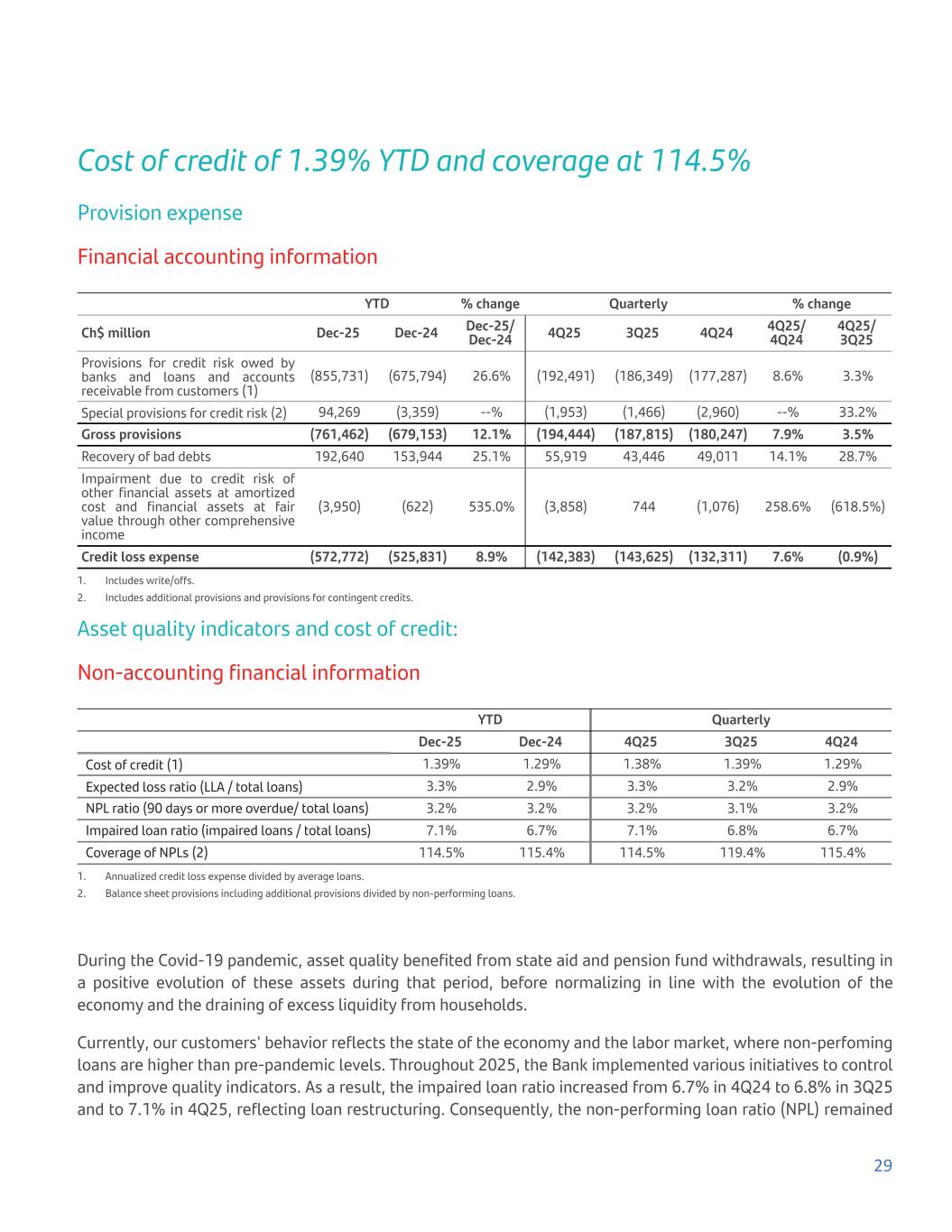 Cost of credit of 1.39% YTD and coverage at 114.5% Provision expense Financial accounting information YTD % change Quarterly % change Ch$ million Dec-25 Dec-24 Dec-25/ Dec-24 4Q25 3Q25 4Q24 4Q25/ 4Q24 4Q25/ 3Q25 Provisions for credit risk owed by banks and loans and accounts receivable from customers (1) (855,731) (675,794) 26.6% (192,491) (186,349) (177,287) 8.6% 3.3% Special provisions for credit risk (2) 94,269 (3,359) --% (1,953) (1,466) (2,960) --% 33.2% Gross provisions (761,462) (679,153) 12.1% (194,444) (187,815) (180,247) 7.9% 3.5% Recovery of bad debts 192,640 153,944 25.1% 55,919 43,446 49,011 14.1% 28.7% Impairment due to credit risk of other financial assets at amortized cost and financial assets at fair value through other comprehensive income (3,950) (622) 535.0% (3,858) 744 (1,076) 258.6% (618.5%) Credit loss expense (572,772) (525,831) 8.9% (142,383) (143,625) (132,311) 7.6% (0.9%) 1. Includes write/offs. 2. Includes additional provisions and provisions for contingent credits. Asset quality indicators and cost of credit: Non-accounting financial information YTD Quarterly Dec-25 Dec-24 4Q25 3Q25 4Q24 Cost of credit (1) 1.39% 1.29% 1.38% 1.39% 1.29% Expected loss ratio (LLA / total loans) 3.3% 2.9% 3.3% 3.2% 2.9% NPL ratio (90 days or more overdue/ total loans) 3.2% 3.2% 3.2% 3.1% 3.2% Impaired loan ratio (impaired loans / total loans) 7.1% 6.7% 7.1% 6.8% 6.7% Coverage of NPLs (2) 114.5% 115.4% 114.5% 119.4% 115.4% 1. Annualized credit loss expense divided by average loans. 2. Balance sheet provisions including additional provisions divided by non-performing loans. During the Covid-19 pandemic, asset quality benefited from state aid and pension fund withdrawals, resulting in a positive evolution of these assets during that period, before normalizing in line with the evolution of the economy and the draining of excess liquidity from households. Currently, our customers' behavior reflects the state of the economy and the labor market, where non-perfoming loans are higher than pre-pandemic levels. Throughout 2025, the Bank implemented various initiatives to control and improve quality indicators. As a result, the impaired loan ratio increased from 6.7% in 4Q24 to 6.8% in 3Q25 and to 7.1% in 4Q25, reflecting loan restructuring. Consequently, the non-performing loan ratio (NPL) remained 29