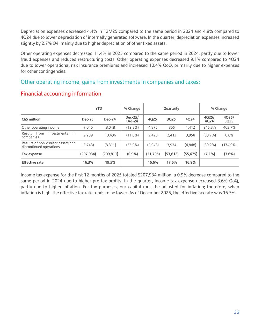 Depreciation expenses decreased 4.4% in 12M25 compared to the same period in 2024 and 4.8% compared to 4Q24 due to lower depreciation of internally generated software. In the quarter, depreciation expenses increased slightly by 2.7% Q4, mainly due to higher depreciation of other fixed assets. Other operating expenses decreased 11.4% in 2025 compared to the same period in 2024, partly due to lower fraud expenses and reduced restructuring costs. Other operating expenses decreased 9.1% compared to 4Q24 due to lower operational risk insurance premiums and increased 10.4% QoQ, primarily due to higher expenses for other contingencies. Other operating income, gains from investments in companies and taxes: Financial accounting information YTD % Change Quarterly % Change Ch$ million Dec-25 Dec-24 Dec-25/ Dec-24 4Q25 3Q25 4Q24 4Q25/ 4Q24 4Q25/ 3Q25 Other operating income 7,016 8,048 (12.8%) 4,876 865 1,412 245.3% 463.7% Result from investments in companies 9,289 10,436 (11.0%) 2,426 2,412 3,958 (38.7%) 0.6% Results of non-current assets and discontinued operations (3,743) (8,311) (55.0%) (2,948) 3,934 (4,848) (39.2%) (174.9%) Tax expense (207,934) (209,811) (0.9%) (51,705) (53,612) (55,675) (7.1%) (3.6%) Effective rate 16.3% 19.5% 16.6% 17.6% 16.9% Income tax expense for the first 12 months of 2025 totaled $207,934 million, a 0.9% decrease compared to the same period in 2024 due to higher pre-tax profits. In the quarter, income tax expense decreased 3.6% QoQ, partly due to higher inflation. For tax purposes, our capital must be adjusted for inflation; therefore, when inflation is high, the effective tax rate tends to be lower. As of December 2025, the effective tax rate was 16.3%. 36