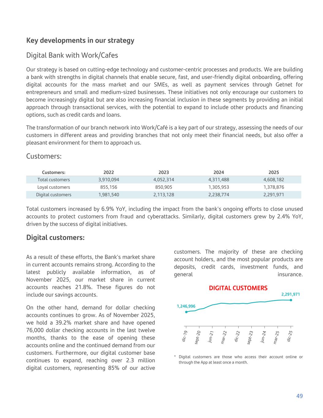 Key developments in our strategy Digital Bank with Work/Cafes Our strategy is based on cutting-edge technology and customer-centric processes and products. We are building a bank with strengths in digital channels that enable secure, fast, and user-friendly digital onboarding, offering digital accounts for the mass market and our SMEs, as well as payment services through Getnet for entrepreneurs and small and medium-sized businesses. These initiatives not only encourage our customers to become increasingly digital but are also increasing financial inclusion in these segments by providing an initial approach through transactional services, with the potential to expand to include other products and financing options, such as credit cards and loans. The transformation of our branch network into Work/Café is a key part of our strategy, assessing the needs of our customers in different areas and providing branches that not only meet their financial needs, but also offer a pleasant environment for them to approach us. Customers: Customers: 2022 2023 2024 2025 Total customers 3,910,094 4,052,314 4,311,488 4,608,182 Loyal customers 855,156 850,905 1,305,953 1,378,876 Digital customers 1,981,540 2,113,128 2,238,774 2,291,971 Total customers increased by 6.9% YoY, including the impact from the bank's ongoing efforts to close unused accounts to protect customers from fraud and cyberattacks. Similarly, digital customers grew by 2.4% YoY, driven by the success of digital initiatives. Digital customers: As a result of these efforts, the Bank's market share in current accounts remains strong. According to the latest publicly available information, as of November 2025, our market share in current accounts reaches 21.8%. These figures do not include our savings accounts. On the other hand, demand for dollar checking accounts continues to grow. As of November 2025, we hold a 39.2% market share and have opened 76,000 dollar checking accounts in the last twelve months, thanks to the ease of opening these accounts online and the continued demand from our customers. Furthermore, our digital customer base continues to expand, reaching over 2.3 million digital customers, representing 85% of our active customers. The majority of these are checking account holders, and the most popular products are deposits, credit cards, investment funds, and general insurance. DIGITAL CUSTOMERS 1,246,996 2,291,971 di c- 19 se pt -2 0 ju n- 21 m ar -2 2 di c- 22 se pt -2 3 ju n- 24 m ar -2 5 di c- 25 * Digital customers are those who access their account online or through the App at least once a month. 49