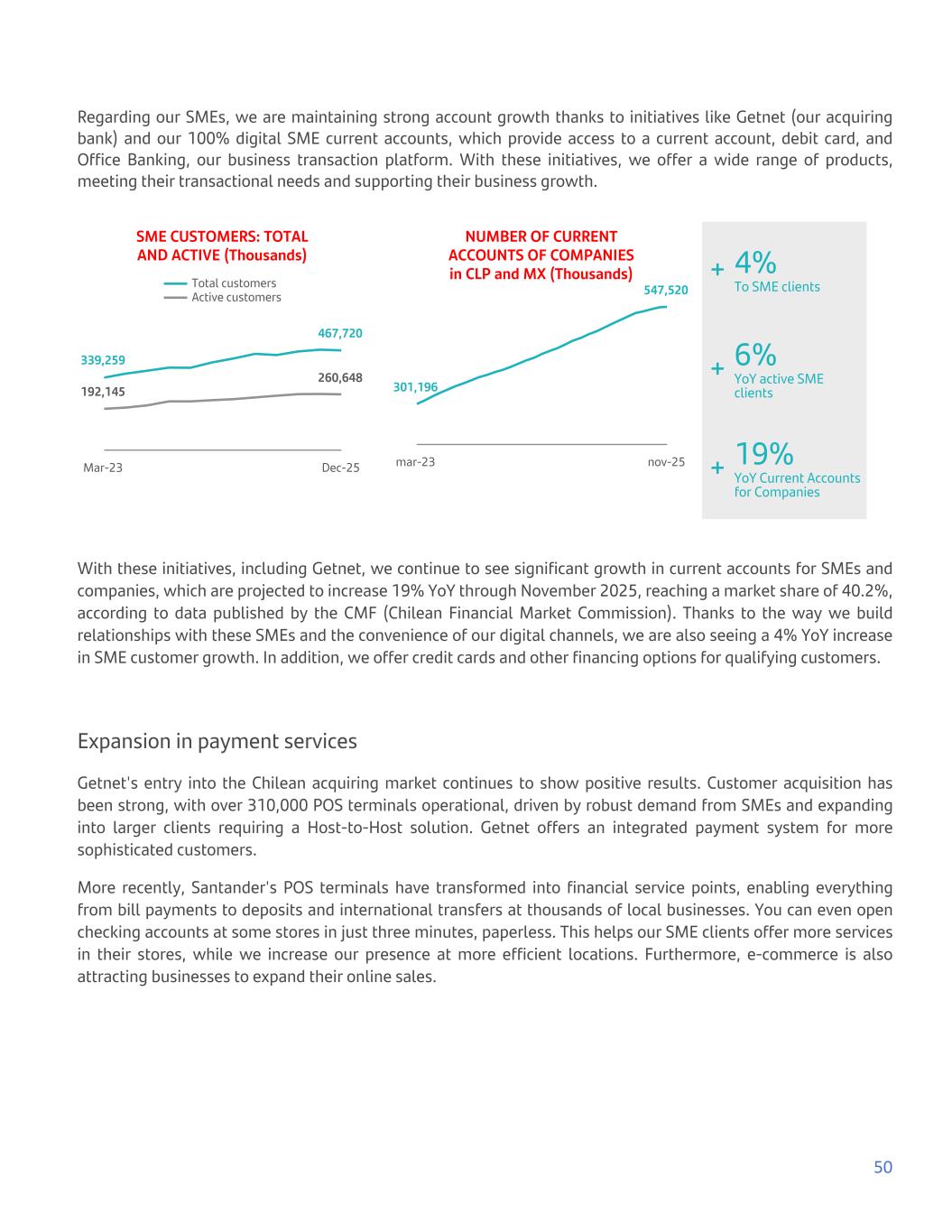Regarding our SMEs, we are maintaining strong account growth thanks to initiatives like Getnet (our acquiring bank) and our 100% digital SME current accounts, which provide access to a current account, debit card, and Office Banking, our business transaction platform. With these initiatives, we offer a wide range of products, meeting their transactional needs and supporting their business growth. SME CUSTOMERS: TOTAL AND ACTIVE (Thousands) 339,259 467,720 192,145 260,648 Total customers Active customers Mar-23 Dec-25 NUMBER OF CURRENT ACCOUNTS OF COMPANIES in CLP and MX (Thousands) 301,196 547,520 mar-23 nov-25 + 4% To SME clients + 6% YoY active SME clients + 19% YoY Current Accounts for Companies With these initiatives, including Getnet, we continue to see significant growth in current accounts for SMEs and companies, which are projected to increase 19% YoY through November 2025, reaching a market share of 40.2%, according to data published by the CMF (Chilean Financial Market Commission). Thanks to the way we build relationships with these SMEs and the convenience of our digital channels, we are also seeing a 4% YoY increase in SME customer growth. In addition, we offer credit cards and other financing options for qualifying customers. Expansion in payment services Getnet's entry into the Chilean acquiring market continues to show positive results. Customer acquisition has been strong, with over 310,000 POS terminals operational, driven by robust demand from SMEs and expanding into larger clients requiring a Host-to-Host solution. Getnet offers an integrated payment system for more sophisticated customers. More recently, Santander's POS terminals have transformed into financial service points, enabling everything from bill payments to deposits and international transfers at thousands of local businesses. You can even open checking accounts at some stores in just three minutes, paperless. This helps our SME clients offer more services in their stores, while we increase our presence at more efficient locations. Furthermore, e-commerce is also attracting businesses to expand their online sales. 50