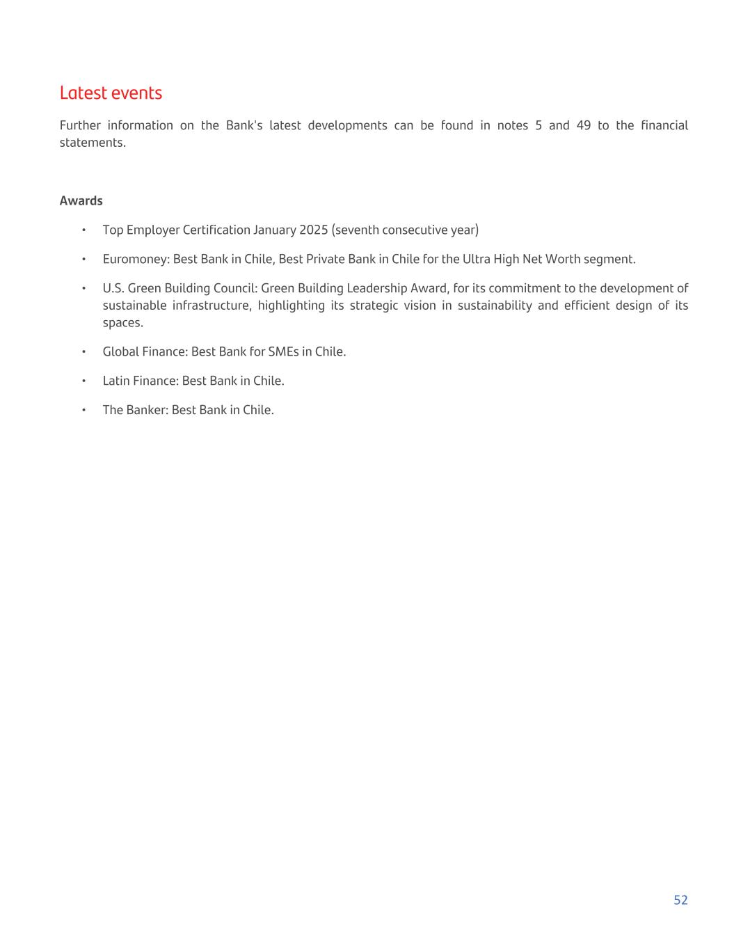 Latest events Further information on the Bank's latest developments can be found in notes 5 and 49 to the financial statements. Awards • Top Employer Certification January 2025 (seventh consecutive year) • Euromoney: Best Bank in Chile, Best Private Bank in Chile for the Ultra High Net Worth segment. • U.S. Green Building Council: Green Building Leadership Award, for its commitment to the development of sustainable infrastructure, highlighting its strategic vision in sustainability and efficient design of its spaces. • Global Finance: Best Bank for SMEs in Chile. • Latin Finance: Best Bank in Chile. • The Banker: Best Bank in Chile. 52