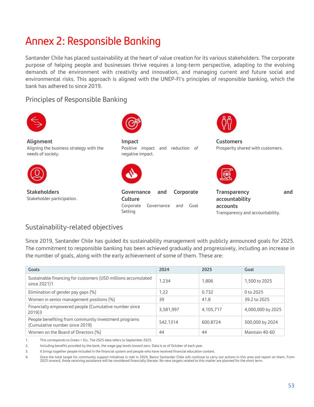 Annex 2: Responsible Banking Santander Chile has placed sustainability at the heart of value creation for its various stakeholders. The corporate purpose of helping people and businesses thrive requires a long-term perspective, adapting to the evolving demands of the environment with creativity and innovation, and managing current and future social and environmental risks. This approach is aligned with the UNEP-FI's principles of responsible banking, which the bank has adhered to since 2019. Principles of Responsible Banking Alignment Aligning the business strategy with the needs of society. Impact Positive impact and reduction of negative impact. Customers Prosperity shared with customers. Stakeholders Stakeholder participation. Governance and Corporate Culture Corporate Governance and Goal Setting Transparency and accountability accounts Transparency and accountability. Sustainability-related objectives Since 2019, Santander Chile has guided its sustainability management with publicly announced goals for 2025. The commitment to responsible banking has been achieved gradually and progressively, including an increase in the number of goals, along with the early achievement of some of them. These are: Goals 2024 2025 Goal Sustainable financing for customers (USD millions accumulated since 2021)1 1.234 1,806 1,500 to 2025 Elimination of gender pay gaps (%) 1.22 0.732 0 to 2025 Women in senior management positions (%) 39 41.8 39.2 to 2025 Financially empowered people (Cumulative number since 2019)3 3,581,997 4,105,717 4,000,000 by 2025 People benefiting from community investment programs (Cumulative number since 2019) 542.1314 600.8724 500,000 by 2024 Women on the Board of Directors (%) 44 44 Maintain 40-60 1. This corresponds to Green + SLL. The 2025 data refers to September 2025. 2. Including benefits provided by the bank, the wage gap tends toward zero. Data is as of October of each year. 3. It brings together people included in the financial system and people who have received financial education content. 4. Once the total target for community support initiatives is met in 2024, Banco Santander Chile will continue to carry out actions in this area and report on them. From 2025 onward, those receiving assistance will be considered financially literate. No new targets related to this matter are planned for the short term. 53