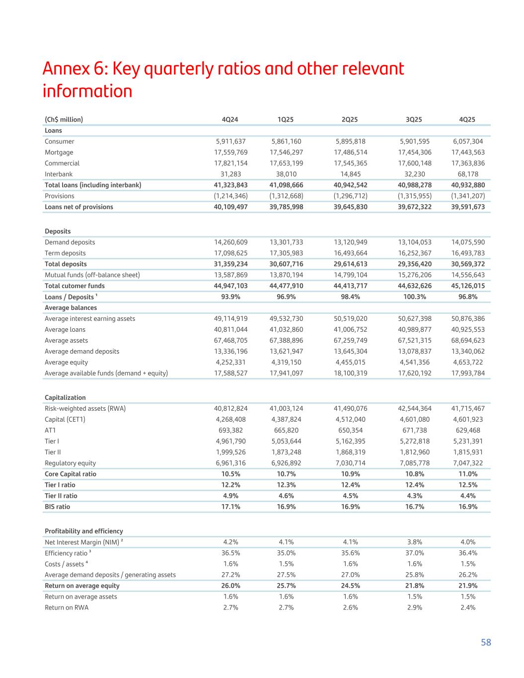 Annex 6: Key quarterly ratios and other relevant information (Ch$ million) 4Q24 1Q25 2Q25 3Q25 4Q25 Loans Consumer 5,911,637 5,861,160 5,895,818 5,901,595 6,057,304 Mortgage 17,559,769 17,546,297 17,486,514 17,454,306 17,443,563 Commercial 17,821,154 17,653,199 17,545,365 17,600,148 17,363,836 Interbank 31,283 38,010 14,845 32,230 68,178 Total loans (including interbank) 41,323,843 41,098,666 40,942,542 40,988,278 40,932,880 Provisions (1,214,346) (1,312,668) (1,296,712) (1,315,955) (1,341,207) Loans net of provisions 40,109,497 39,785,998 39,645,830 39,672,322 39,591,673 Deposits Demand deposits 14,260,609 13,301,733 13,120,949 13,104,053 14,075,590 Term deposits 17,098,625 17,305,983 16,493,664 16,252,367 16,493,783 Total deposits 31,359,234 30,607,716 29,614,613 29,356,420 30,569,372 Mutual funds (off-balance sheet) 13,587,869 13,870,194 14,799,104 15,276,206 14,556,643 Total cutomer funds 44,947,103 44,477,910 44,413,717 44,632,626 45,126,015 Loans / Deposits ¹ 93.9% 96.9% 98.4% 100.3% 96.8% Average balances Average interest earning assets 49,114,919 49,532,730 50,519,020 50,627,398 50,876,386 Average loans 40,811,044 41,032,860 41,006,752 40,989,877 40,925,553 Average assets 67,468,705 67,388,896 67,259,749 67,521,315 68,694,623 Average demand deposits 13,336,196 13,621,947 13,645,304 13,078,837 13,340,062 Average equity 4,252,331 4,319,150 4,455,015 4,541,356 4,653,722 Average available funds (demand + equity) 17,588,527 17,941,097 18,100,319 17,620,192 17,993,784 Capitalization Risk-weighted assets (RWA) 40,812,824 41,003,124 41,490,076 42,544,364 41,715,467 Capital (CET1) 4,268,408 4,387,824 4,512,040 4,601,080 4,601,923 AT1 693,382 665,820 650,354 671,738 629,468 Tier I 4,961,790 5,053,644 5,162,395 5,272,818 5,231,391 Tier II 1,999,526 1,873,248 1,868,319 1,812,960 1,815,931 Regulatory equity 6,961,316 6,926,892 7,030,714 7,085,778 7,047,322 Core Capital ratio 10.5% 10.7% 10.9% 10.8% 11.0% Tier I ratio 12.2% 12.3% 12.4% 12.4% 12.5% Tier II ratio 4.9% 4.6% 4.5% 4.3% 4.4% BIS ratio 17.1% 16.9% 16.9% 16.7% 16.9% Profitability and efficiency Net Interest Margin (NIM) ² 4.2% 4.1% 4.1% 3.8% 4.0% Efficiency ratio ³ 36.5% 35.0% 35.6% 37.0% 36.4% Costs / assets ⁴ 1.6% 1.5% 1.6% 1.6% 1.5% Average demand deposits / generating assets 27.2% 27.5% 27.0% 25.8% 26.2% Return on average equity 26.0% 25.7% 24.5% 21.8% 21.9% Return on average assets 1.6% 1.6% 1.6% 1.5% 1.5% Return on RWA 2.7% 2.7% 2.6% 2.9% 2.4% 58