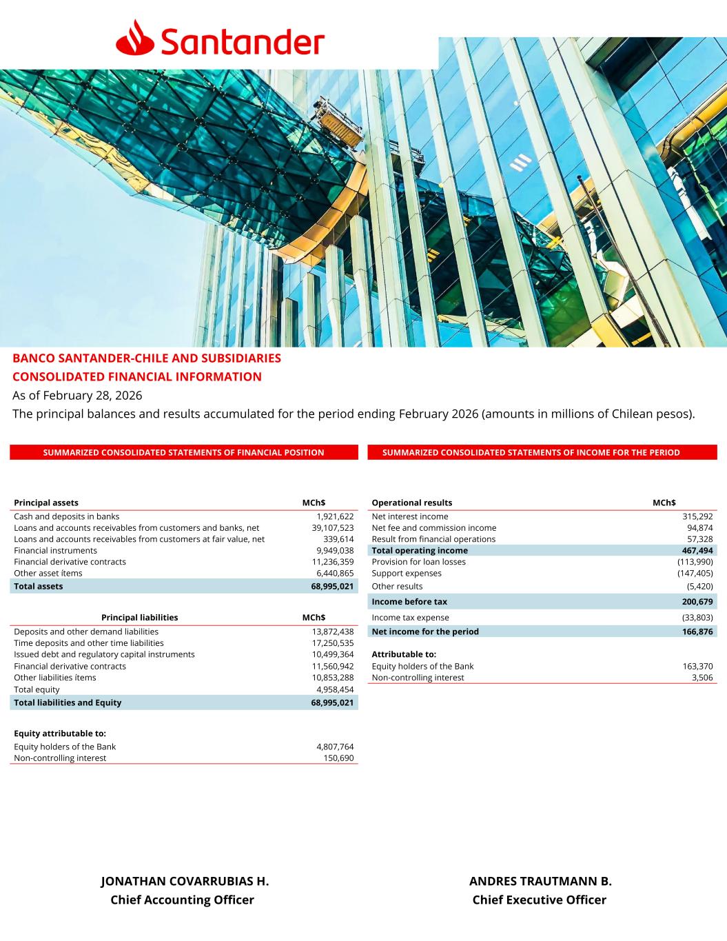 SUMMARIZED CONSOLIDATED STATEMENTS OF FINANCIAL POSITION SUMMARIZED CONSOLIDATED STATEMENTS OF INCOME FOR THE PERIOD Principal assets MCh$ Operational results MCh$ Cash and deposits in banks 1,921,622 Net interest income 315,292 Loans and accounts receivables from customers and banks, net 39,107,523 Net fee and commission income 94,874 Loans and accounts receivables from customers at fair value, net 339,614 Result from financial operations 57,328 Financial instruments 9,949,038 Total operating income 467,494 Financial derivative contracts 11,236,359 Provision for loan losses (113,990) Other asset ítems 6,440,865 Support expenses (147,405) Total assets 68,995,021 Other results (5,420) Income before tax 200,679 Principal liabilities MCh$ Income tax expense (33,803) Deposits and other demand liabilities 13,872,438 Net income for the period 166,876 Time deposits and other time liabilities 17,250,535 Issued debt and regulatory capital instruments 10,499,364 Attributable to: Financial derivative contracts 11,560,942 Equity holders of the Bank 163,370 Other liabilities ítems 10,853,288 Non-controlling interest 3,506 Total equity 4,958,454 Total liabilities and Equity 68,995,021 Equity attributable to: Equity holders of the Bank 4,807,764 Non-controlling interest 150,690 BANCO SANTANDER-CHILE AND SUBSIDIARIES CONSOLIDATED FINANCIAL INFORMATION As of February 28, 2026 The principal balances and results accumulated for the period ending February 2026 (amounts in millions of Chilean pesos). JONATHAN COVARRUBIAS H. ANDRES TRAUTMANN B. Chief Accounting Officer Chief Executive Officer