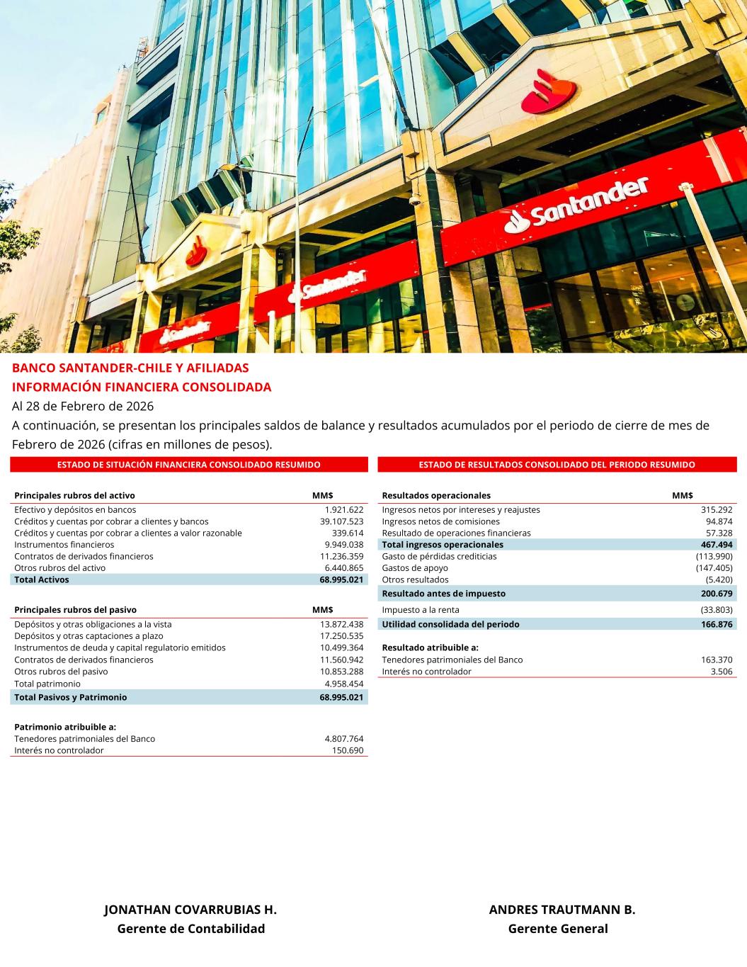 B ESTADO DE SITUACIÓN FINANCIERA CONSOLIDADO RESUMIDO ESTADO DE RESULTADOS CONSOLIDADO DEL PERIODO RESUMIDO Principales rubros del activo MM$ Resultados operacionales MM$ Efectivo y depósitos en bancos 1.921.622 Ingresos netos por intereses y reajustes 315.292 Créditos y cuentas por cobrar a clientes y bancos 39.107.523 Ingresos netos de comisiones 94.874 Créditos y cuentas por cobrar a clientes a valor razonable 339.614 Resultado de operaciones financieras 57.328 Instrumentos financieros 9.949.038 Total ingresos operacionales 467.494 Contratos de derivados financieros 11.236.359 Gasto de pérdidas crediticias (113.990) Otros rubros del activo 6.440.865 Gastos de apoyo (147.405) Total Activos 68.995.021 Otros resultados (5.420) Resultado antes de impuesto 200.679 Principales rubros del pasivo MM$ Impuesto a la renta (33.803) Depósitos y otras obligaciones a la vista 13.872.438 Utilidad consolidada del periodo 166.876 Depósitos y otras captaciones a plazo 17.250.535 Instrumentos de deuda y capital regulatorio emitidos 10.499.364 Resultado atribuible a: Contratos de derivados financieros 11.560.942 Tenedores patrimoniales del Banco 163.370 Otros rubros del pasivo 10.853.288 Interés no controlador 3.506 Total patrimonio 4.958.454 Total Pasivos y Patrimonio 68.995.021 Patrimonio atribuible a: Tenedores patrimoniales del Banco 4.807.764 Interés no controlador 150.690 BANCO SANTANDER-CHILE Y AFILIADAS INFORMACIÓN FINANCIERA CONSOLIDADA Al 28 de Febrero de 2026 A continuación, se presentan los principales saldos de balance y resultados acumulados por el periodo de cierre de mes de Febrero de 2026 (cifras en millones de pesos). JONATHAN COVARRUBIAS H. ANDRES TRAUTMANN B. Gerente de Contabilidad Gerente General