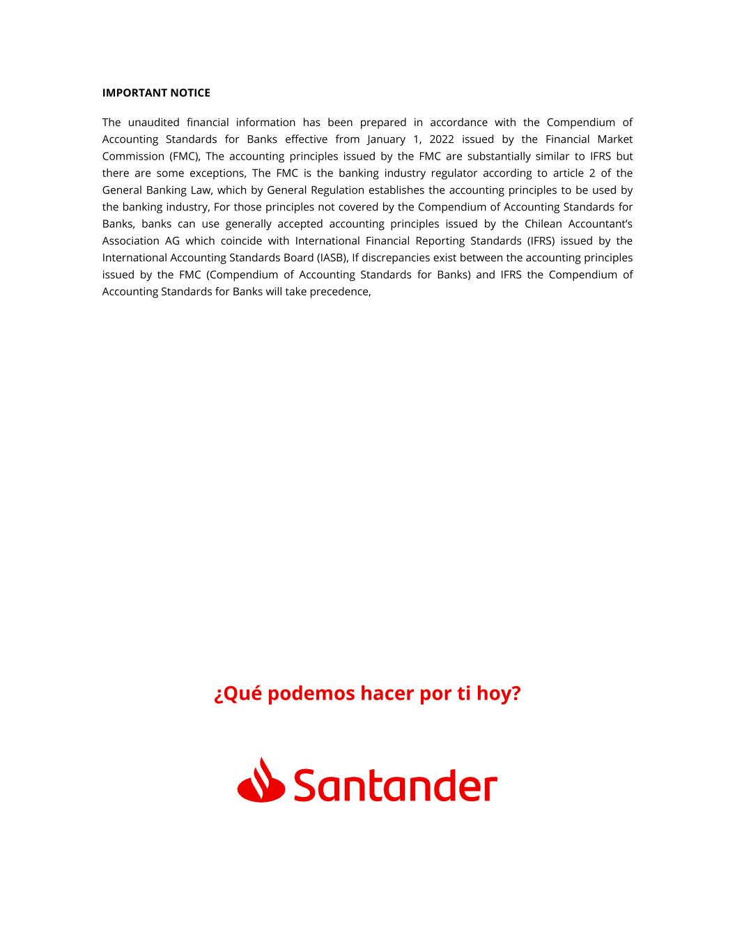 IMPORTANT NOTICE The unaudited financial information has been prepared in accordance with the Compendium of Accounting Standards for Banks effective from January 1, 2022 issued by the Financial Market Commission (FMC), The accounting principles issued by the FMC are substantially similar to IFRS but there are some exceptions, The FMC is the banking industry regulator according to article 2 of the General Banking Law, which by General Regulation establishes the accounting principles to be used by the banking industry, For those principles not covered by the Compendium of Accounting Standards for Banks, banks can use generally accepted accounting principles issued by the Chilean Accountant’s Association AG which coincide with International Financial Reporting Standards (IFRS) issued by the International Accounting Standards Board (IASB), If discrepancies exist between the accounting principles issued by the FMC (Compendium of Accounting Standards for Banks) and IFRS the Compendium of Accounting Standards for Banks will take precedence, ¿Qué podemos hacer por ti hoy?