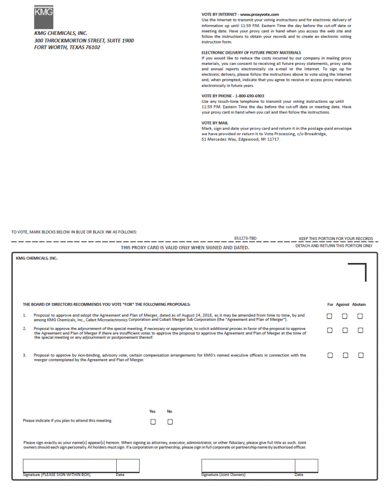VOTE BY INTERNET - www.proxyvote.com Use the Internet to transmit your voting instructions and for electronic delivery of information up until 11:59 P.M. Eastern Time the day before the cut-off date or meeting date. Have your proxy card in hand when you access the web site and follow the instructions to obtain your records and to create an electronic voting instruction form. KMG CHEMICALS, INC. 300 THROCKMORTON STREET, SUITE 1900 FORT WORTH, TEXAS 76102 ELECTRONIC DELIVERY OF FUTURE PROXY MATERIALS If you would like to reduce the costs incurred by our company in mailing proxy materials, you can consent to receiving all future proxy statements, proxy cards and annual reports electronically via e-mail or the Internet. To sign up for electronic delivery, please follow the instructions above to vote using the Internet and, when prompted, indicate that you agree to receive or access proxy materials electronically in future years. VOTE BY PHONE - 1-800-690-6903 Use any touch-tone telephone to transmit your voting instructions up until 11:59 P.M. Eastern Time the day before the cut-off date or meeting date. Have your proxy card in hand when you call and then follow the instructions. VOTE BY MAIL Mark, sign and date your proxy card and return it in the postage-paid envelope we have provided or return it to Vote Processing, c/o Broadridge, 51 Mercedes Way, Edgewood, NY 11717. TO VOTE, MARK BLOCKS BELOW IN BLUE OR BLACK INK AS FOLLOWS: E51273-TBD KEEP THIS PORTION FOR YOUR RECORDS DETACH AND RETURN THIS PORTION ONLY THIS PROXY CARD IS VALID ONLY WHEN SIGNED AND DATED. KMG CHEMICALS, INC. THE BOARD OF DIRECTORS RECOMMENDS YOU VOTE "FOR" THE FOLLOWING PROPOSALS: For Against Abstain 1. Proposal to approve and adopt the Agreement and Plan of Merger, dated as of August 14, 2018, as it may be amended from time to time, by and among KMG Chemicals, Inc., Cabot Microelectronics Corporation and Cobalt Merger Sub Corporation (the "Agreement and Plan of Merger"). Proposal to approve the adjournment of the special meeting, if necessary or appropriate, to solicit additional proxies in favor of the proposal to approve the Agreement and Plan of Merger if there are insufficient votes to approve the proposal to approve the Agreement and Plan of Merger at the time of the special meeting or any adjournment or postponement thereof. 2. 3. Proposal to approve by non-binding, advisory vote, certain compensation arrangements for KMG's named executive officers in connection with the merger contemplated by the Agreement and Plan of Merger. Yes No Please indicate if you plan to attend this meeting. Please sign exactly as your name(s) appear(s) hereon. When signing as attorney, executor, administrator, or other fiduciary, please give full title as such. Joint owners should each sign personally. All holders must sign. If a corporation or partnership, please sign in full corporate or partnership name by authorized officer. Signature [PLEASE SIGN WITHIN BOX] Date Signature (Joint Owners) Date