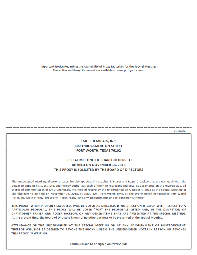 Important Notice Regarding the Availability of Proxy Materials for the Special Meeting: The Notice and Proxy Statement are available at www.proxyvote.com. E51274-TBD KMG CHEMICALS, INC. 300 THROCKMORTON STREET FORT WORTH, TEXAS 76102 SPECIAL MEETING OF SHAREHOLDERS TO BE HELD ON NOVEMBER 13, 2018 THIS PROXY IS SOLICITED BY THE BOARD OF DIRECTORS The undersigned revoking all prior proxies, hereby appoints Christopher T. Fraser and Roger C. Jackson, as proxies, each with the power to appoint his substitute, and hereby authorizes each of them to represent and vote, as designated on the reverse side, all shares of common stock of KMG Chemicals, Inc. held of record by the undersigned on October 4, 2018 at the Special Meeting of Shareholders to be held on November 13, 2018, at 10:00 a.m., Fort Worth time, at The Worthington Renaissance Fort Worth Hotel, 200 Main Street, Fort Worth, Texas 76102, and any adjournments or postponements thereof. THIS PROXY, WHEN PROPERLY EXECUTED, WILL BE VOTED AS DIRECTED. IF NO DIRECTION IS GIVEN WITH RESPECT TO A PARTICULAR PROPOSAL, THIS PROXY WILL BE VOTED "FOR" THE PROPOSALS LISTED AND, IN THE DISCRETION OF CHRISTOPHER FRASER AND ROGER JACKSON, ON ANY OTHER ITEMS THAT ARE PRESENTED AT THE SPECIAL MEETING. At the present time, the Board of Directors knows of no other business to be presented at the Special Meeting. AT TEN DANC E O F THE U N DERSIGN ED AT T HE SPEC IAL M EET ING OR AT AN Y ADJO URNM ENT OR PO STPO NEM EN T THER EO F W ILL N OT BE DEEM ED T O REVO KE T HE PR OXY UN L ESS THE U NDER SIGN ED V OT ES IN P ERSON OR REVO KES THIS PROX Y IN WRI TIN G. Continued and to be signed on reverse side