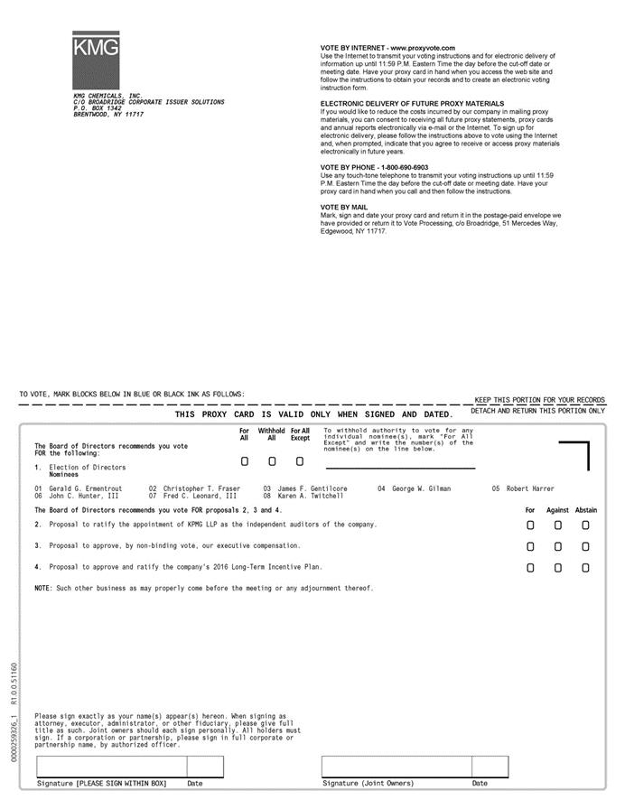 KMG CHEMICALS, INC. C/O BROADRIDGE CORPORATE ISSUER SOLUTIONS P.O. BOX 1342 BRENTWOOD, NY 11717 VOTE BY INTERNET - www.proxyvote.com Use the Internet to transmit your voting instructions and for electronic delivery of information up until 11:59 P.M. Eastern Time the day before the cut-off date or meeting date. Have your proxy card in hand when you access the web site and follow the instructions to obtain your records and to create an electronic voting instruction form. ELECTRONIC DELIVERY OF FUTURE PROXY MATERIALS If you would like to reduce the costs incurred by our company in mailing proxy materials, you can consent to receiving all future proxy statements, proxy cards and annual reports electronically via e-mail or the Internet. To sign up for electronic delivery, please follow the instructions above to vote using the Internet and, when prompted, indicate that you agree to receive or access proxy materials electronically in future years. VOTE BY PHONE - 1-800-690-6903 Use any touch-tone telephone to transmit your voting instructions up until 11:59 P.M. Eastern Time the day before the cut-off date or meeting date. Have your proxy card in hand when you call and then follow the instructions. VOTE BY MAIL Mark, sign and date your proxy card and return it in the postage-paid envelope we have provided or return it to Vote Processing, c/o Broadridge, 51 Mercedes Way, Edgewood, NY 11717. TO VOTE, MARK BLOCKS BELOW IN BLUE OR BLACK INK AS FOLLOWS: KEEP THIS PORTION FOR YOUR RECORDS DETACH AND RETURN THIS PORTION ONLY THIS PROXY CARD IS VALID ONLY WHEN SIGNED AND DATED. For All Withhold All For All Except To withhold authority to vote for any individual nominee(s), mark “For All Except” and write the number(s) of the nominee(s) on the line below. The Board of Directors recommends you vote FOR the following: 1. Election of Directors Nominees 01 Gerald G. Ermentrout 02 Christopher T. Fraser 03 James F. Gentilcore 04 George W. Gilman 05 Robert Harrer 06 John C. Hunter, III 07 Fred C. Leonard, III 08 Karen A. Twitchell The Board of Directors recommends you vote FOR proposals 2, 3 and 4. For Against Abstain 2. Proposal to ratify the appointment of KPMG LLP as the independent auditors of the company. 3. Proposal to approve, by non-binding vote, our executive compensation. 4. Proposal to approve and ratify the company's 2016 Long-Term Incentive Plan. NOTE: Such other business as may properly come before the meeting or any adjournment thereof. 0000259326 1 R1.0.0.51160 Please sign exactly as your name(s) appear(s) hereon. When signing as attorney, executor, administrator, or other fiduciary, please give full title as such. Joint owners should each sign personally. All holders must sign. If a corporation or partnership, please sign in full corporate or partnership name, by authorized officer. Signature [PLEASE SIGN WITHIN BOX] Date Signature (Joint Owners) Date