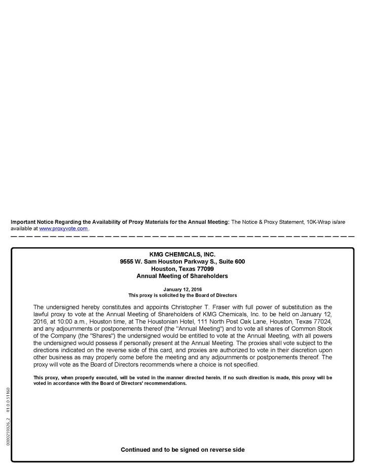 Important Notice Regarding the Availability of Proxy Materials for the Annual Meeting: The Notice & Proxy Statement, 10K-Wrap is/are available at www.proxyvote.com . KMG CHEMICALS, INC. 9555 W. Sam Houston Parkway S., Suite 600 Houston, Texas 77099 Annual Meeting of Shareholders January 12, 2016 This proxy is solicited by the Board of Directors The undersigned hereby constitutes and appoints Christopher T. Fraser with full power of substitution as the lawful proxy to vote at the Annual Meeting of Shareholders of KMG Chemicals, Inc. to be held on January 12, 2016, at 10:00 a.m., Houston time, at The Houstonian Hotel, 111 North Post Oak Lane, Houston, Texas 77024, and any adjournments or postponements thereof (the "Annual Meeting") and to vote all shares of Common Stock of the Company (the "Shares") the undersigned would be entitled to vote at the Annual Meeting, with all powers the undersigned would possess if personally present at the Annual Meeting. The proxies shall vote subject to the directions indicated on the reverse side of this card, and proxies are authorized to vote in their discretion upon other business as may properly come before the meeting and any adjournments or postponements thereof. The proxy will vote as the Board of Directors recommends where a choice is not specified. This proxy, when properly executed, will be voted in the manner directed herein. If no such direction is made, this proxy will be voted in accordance with the Board of Directors' recommendations. 0000259326_2 R1.0.0.51160 Continued and to be signed on reverse side