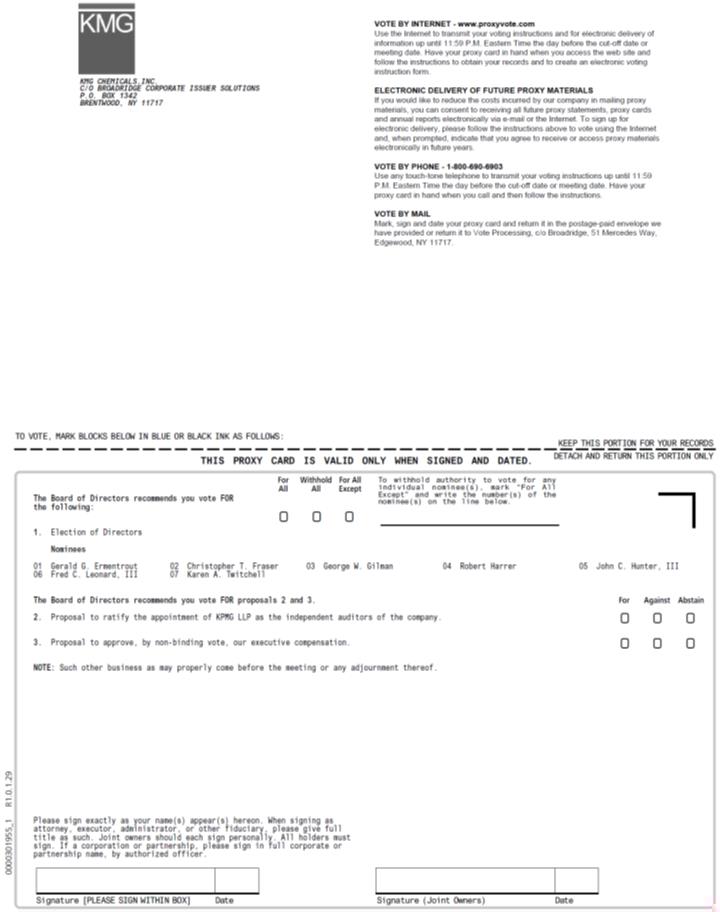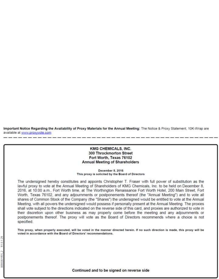CALS, INC. 9555 W. Sam Houston Parkway S., Suite 600 Houston, Texas 77099 Annual Meeting of Shareholders January 12, 2016 This proxy is solicited by the Board of Directors The undersigned hereby constitutes and appoints Christopher T. Fraser with full power of substitution as the lawful proxy to vote at the Annual Meeting of Shareholders of KMG Chemicals, Inc. to be held on January 12, 2016, at 10:00 a.m., Houston time, at The Houstonian Hotel, 111 North Post Oak Lane, Houston, Texas 77024, and any adjournments or postponements thereof (the "Annual Meeting") and to vote all shares of Common Stock of the Company (the "Shares") the undersigned would be entitled to vote at the Annual Meeting, with all powers the undersigned would possess if personally present at the Annual Meeting. The proxies shall vote subject to the directions indicated on the reverse side of this card, and proxies are authorized to vote in their discretion upon other business as may properly come before the meeting and any adjournments or postponements thereof. The proxy will vote as the Board of Directors recommends where a choice is not specified. This proxy, when properly executed, will be voted in the manner directed herein. If no such direction is made, this proxy will be voted in accordance with the Board of Directors' recommendations. 0000259326_2 R1.0.0.51160 Continued and to be signed on reverse side