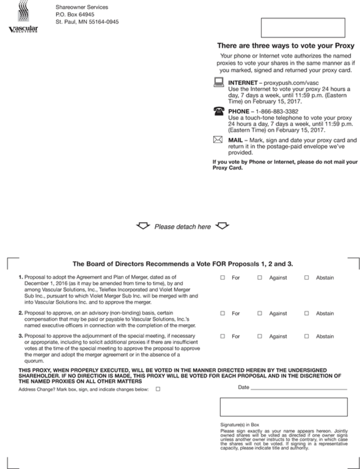 | 1. | To adopt the Agreement and Plan of Merger, dated as of December 1, 2016 (as it may be amended from time to time, which we refer to as the “merger agreement”), by and among Vascular Solutions, Teleflex Incorporated, a Delaware corporation (which we refer to as “Teleflex”), and Violet Merger Sub Inc., a Minnesota corporation and a direct, wholly owned subsidiary of Teleflex (which we refer to as “Merger Sub”), pursuant to which Merger Sub will be merged with and into Vascular Solutions (which we refer to as the “merger”) and to approve the merger; |