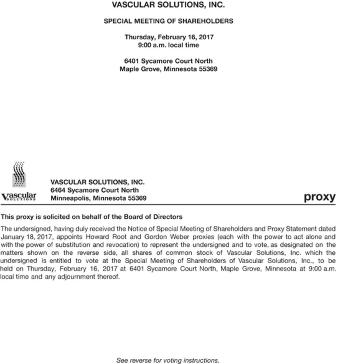 NOTICE IS HEREBY GIVEN that a special meeting of the shareholders of Vascular Solutions, Inc., a Minnesota corporation (which we refer to as “Vascular Solutions,” the “Company,” “we,” “our” or “us”), will be held at 6401 Sycamore Court North, Maple Grove, Minnesota, on Thursday, February 16, 2017 at 9:00 a.m. local time (which we refer to as the “special meeting”), to consider and vote upon the following proposals: