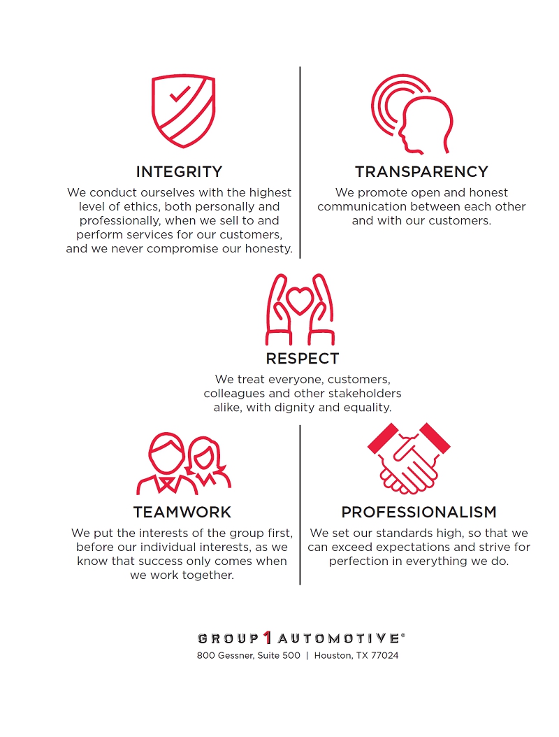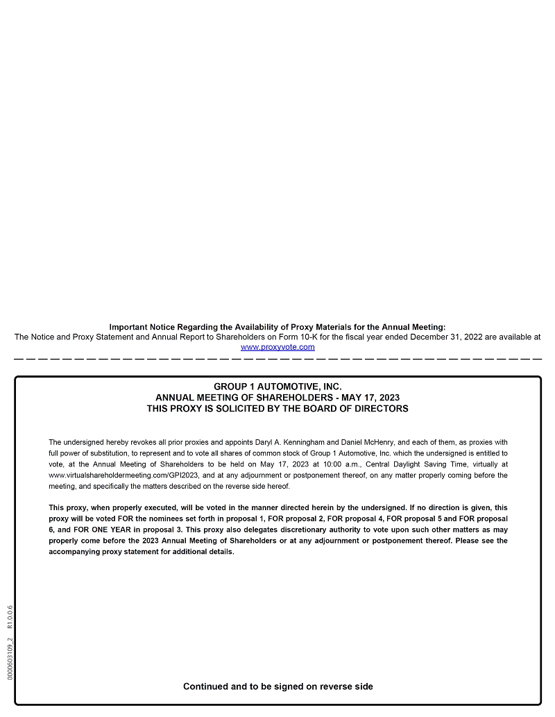 In August 2022, we announced that Earl Hesterberg would retire as our Chief Executive Officer (“CEO”) at the end of 2022 and Daryl Kenningham would become our CEO effective January 1, 2023. Mr. Kenningham joined Group 1 in 2011 and has been an integral part of Group 1’s evolution and success. He embodies the integrity that is at the core of our culture, and we are confident in his ability to lead Group 1 forward with a clear vision and focused strategy. See the section entitled “Compensation Discussion and Analysis – 2022 Pay Decisions for other NEOs”.
