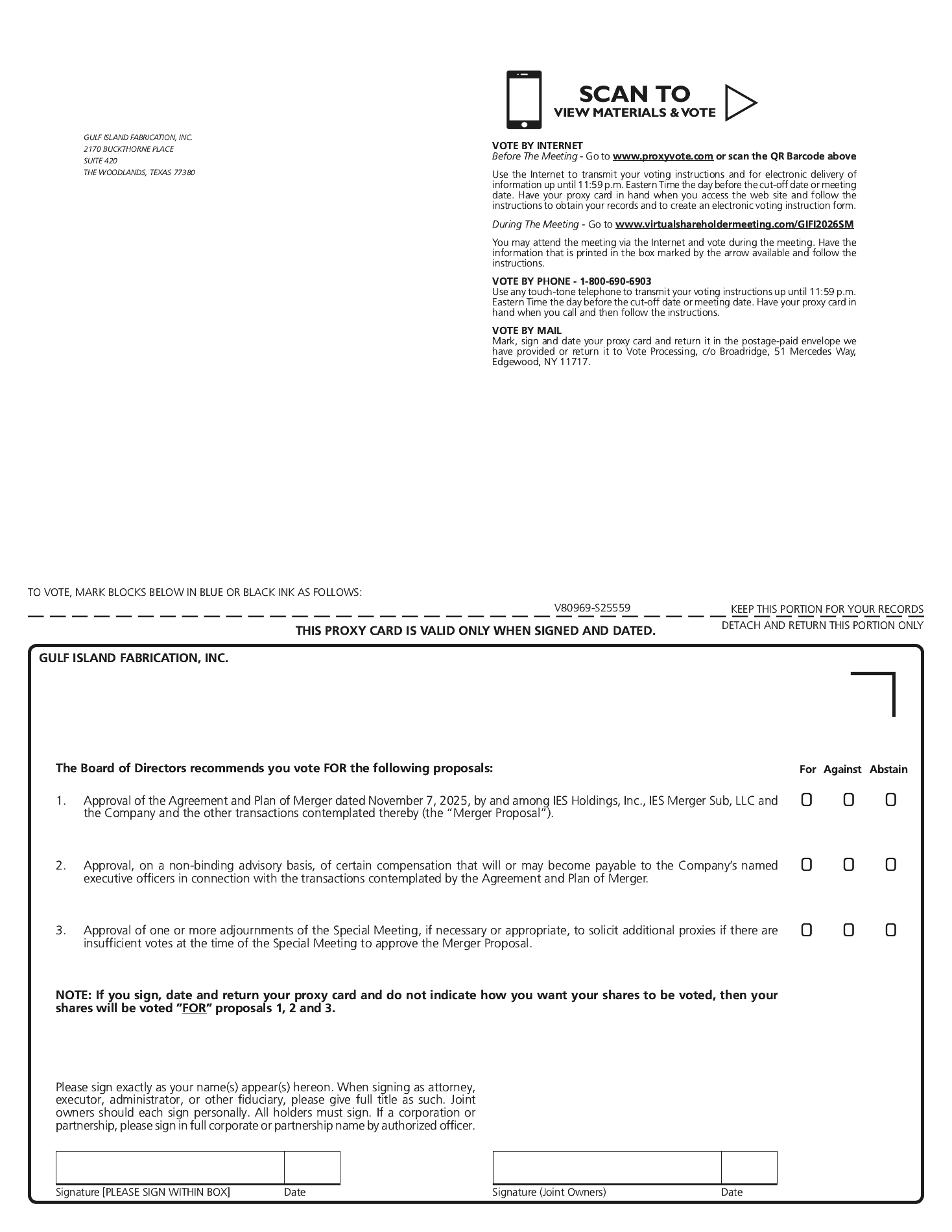 In this proxy statement, all references to “Gulf Island,” the “Company,” “we,” “us,” or “our” refer to Gulf Island Fabrication, Inc. and, where appropriate, its subsidiaries. We refer to IES Holdings, Inc. as “IES” and IES Merger Sub, LLC as “Merger Sub.” The shares of Gulf Island’s common stock, no par value per share, are referred to as “GIFI Common Stock.” All references to the “Merger Agreement” refer to the Agreement and Plan of Merger, dated as of November 7, 2025, by and among Gulf Island, IES and Merger Sub, which is attached as Annex A to this proxy statement. All references to the “Merger” refer to the merger of Merger Sub with and into Gulf Island pursuant to the Merger Agreement, with Gulf Island continuing as the surviving corporation and becoming an indirect wholly owned subsidiary of IES. Gulf Island, following the completion of the Merger, is sometimes referred to as the “Surviving Corporation.” All references to the “Special Meeting” refer to the special meeting of the shareholders of Gulf Island to be held virtually via the Internet on January 13, 2026 beginning at 9:00 a.m., Central Time, including any adjournment or postponement thereof.