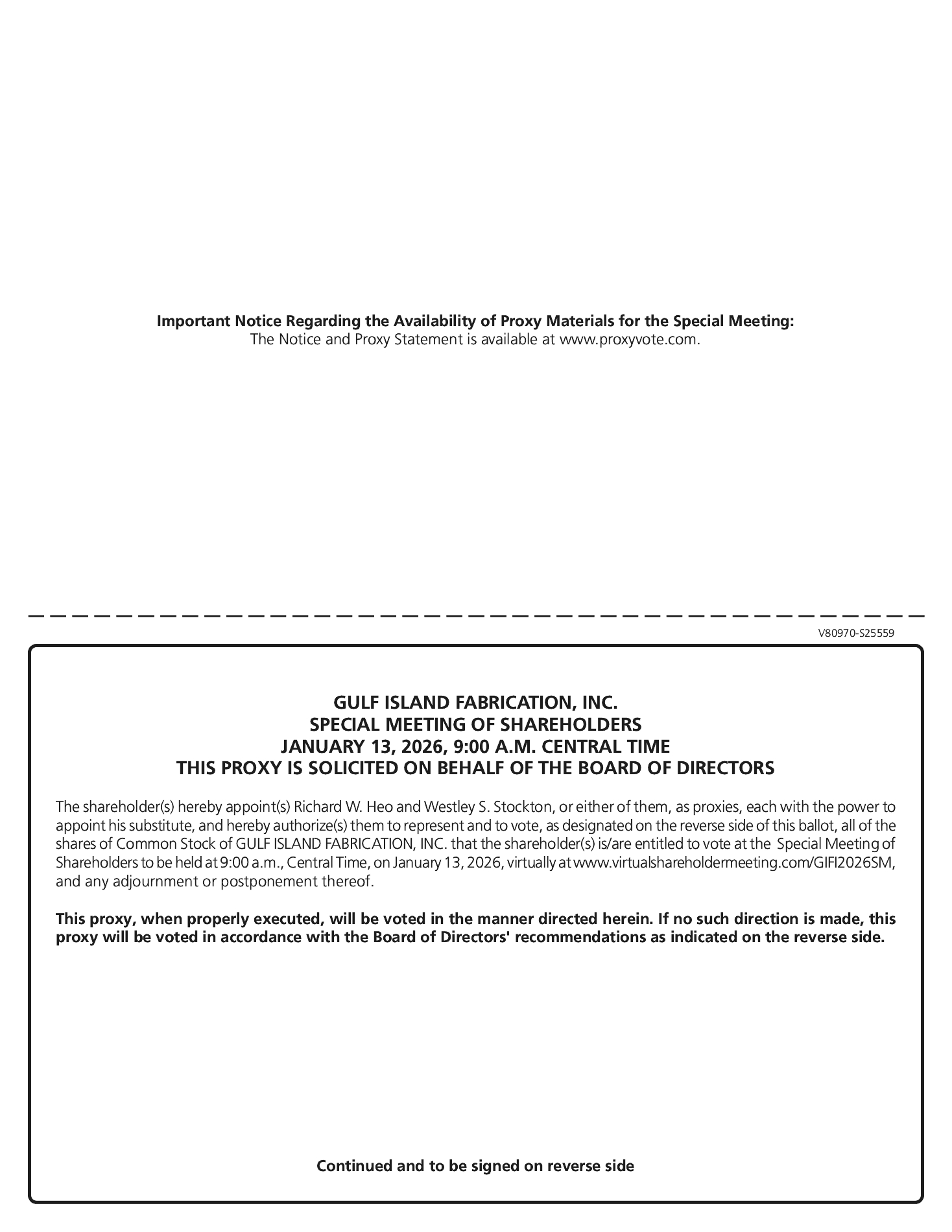A special meeting of the shareholders (the “Special Meeting”) of Gulf Island Fabrication, Inc. (the “Company,” “we” or “our”) will be held at 9:00 a.m., Central Time, on Tuesday, January 13, 2026, exclusively via live webcast by logging into www.virtualshareholdermeeting.com/GIFI2026SM, for the following purposes, as more fully described in the enclosed proxy statement: