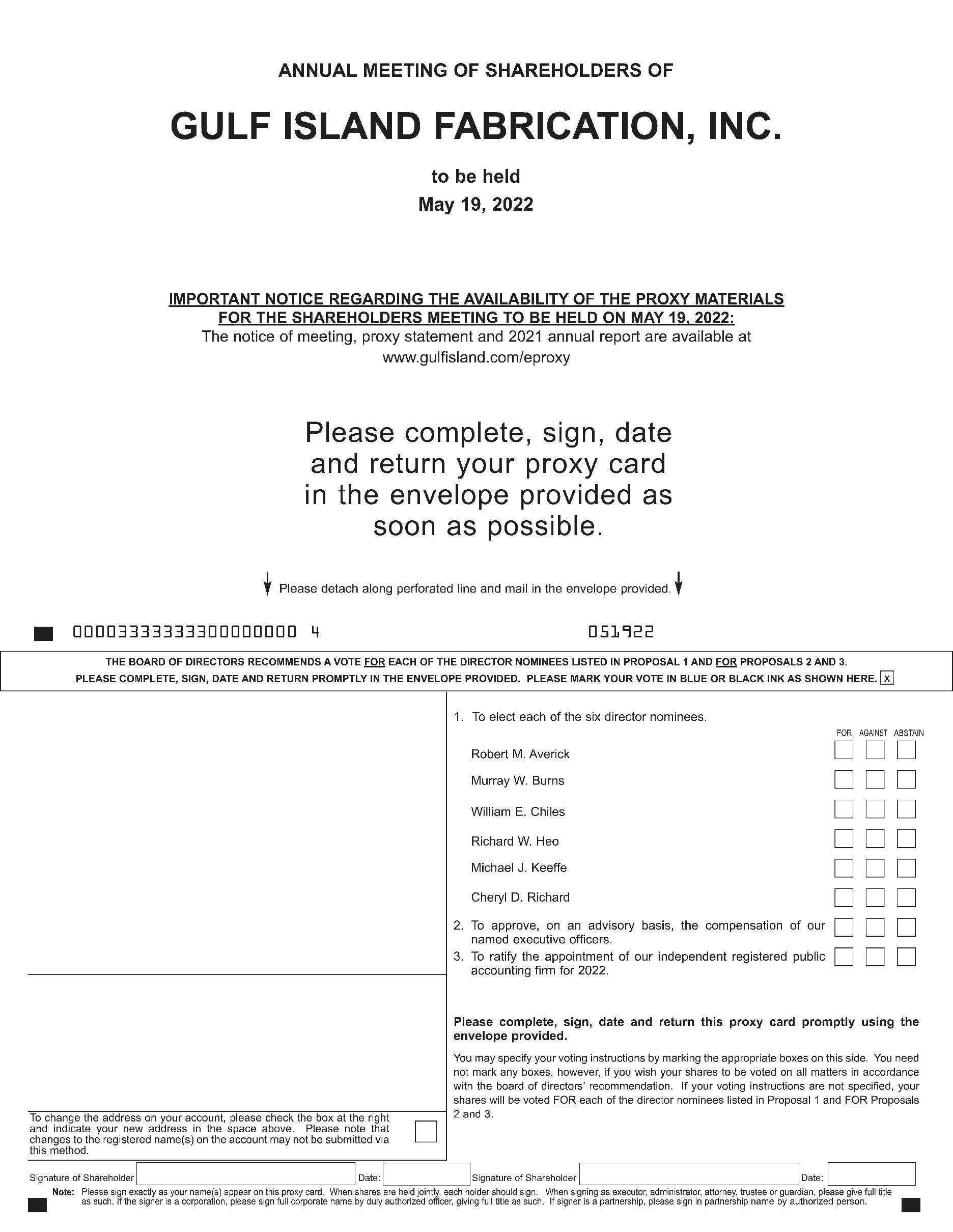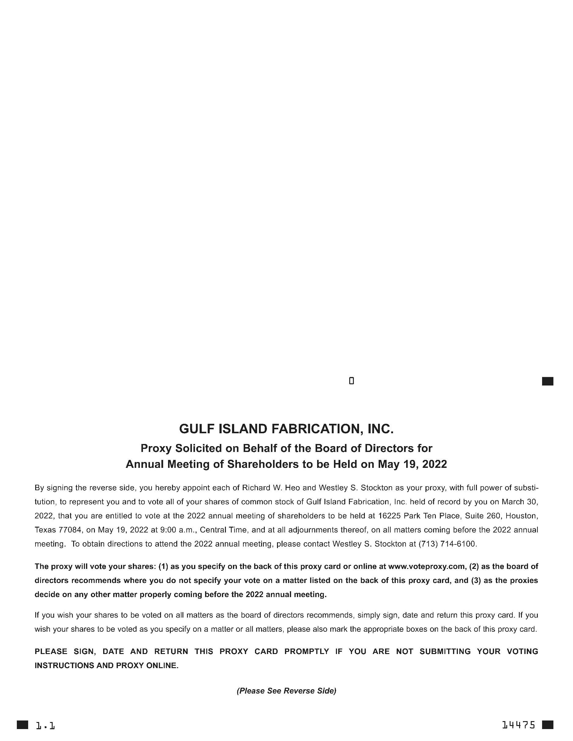 By signing the reverse side, you hereby appoint each ofRichard W. Heo and WestleyS. Stockton as your proxy, with full power of substitution, to represent you and to vote all of your shares of common stock ofGulfIsland Fabrication, Inc. held of recordbyyou on March 30, 2022, that you are entitled to vote at the 2022 annual meeting of shareholders to be held at 16225 Park Ten Place, Suite 260, Houston, Texas 77084, on May 19, 2022 at 9:00 a.m., CentralTime, and at all adjournments thereof, on all matters coming before the 2022 annual meeting. To obtain directions to attend the 2022 annual meeting, please contact Westley S. Stockton at (713) 714-6100.